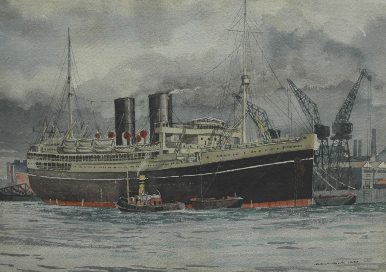 Robert Trenaman Back kunstwerk • aquarel • tekening • voorheen te koop Het stoomschip Parapindi aan de kade