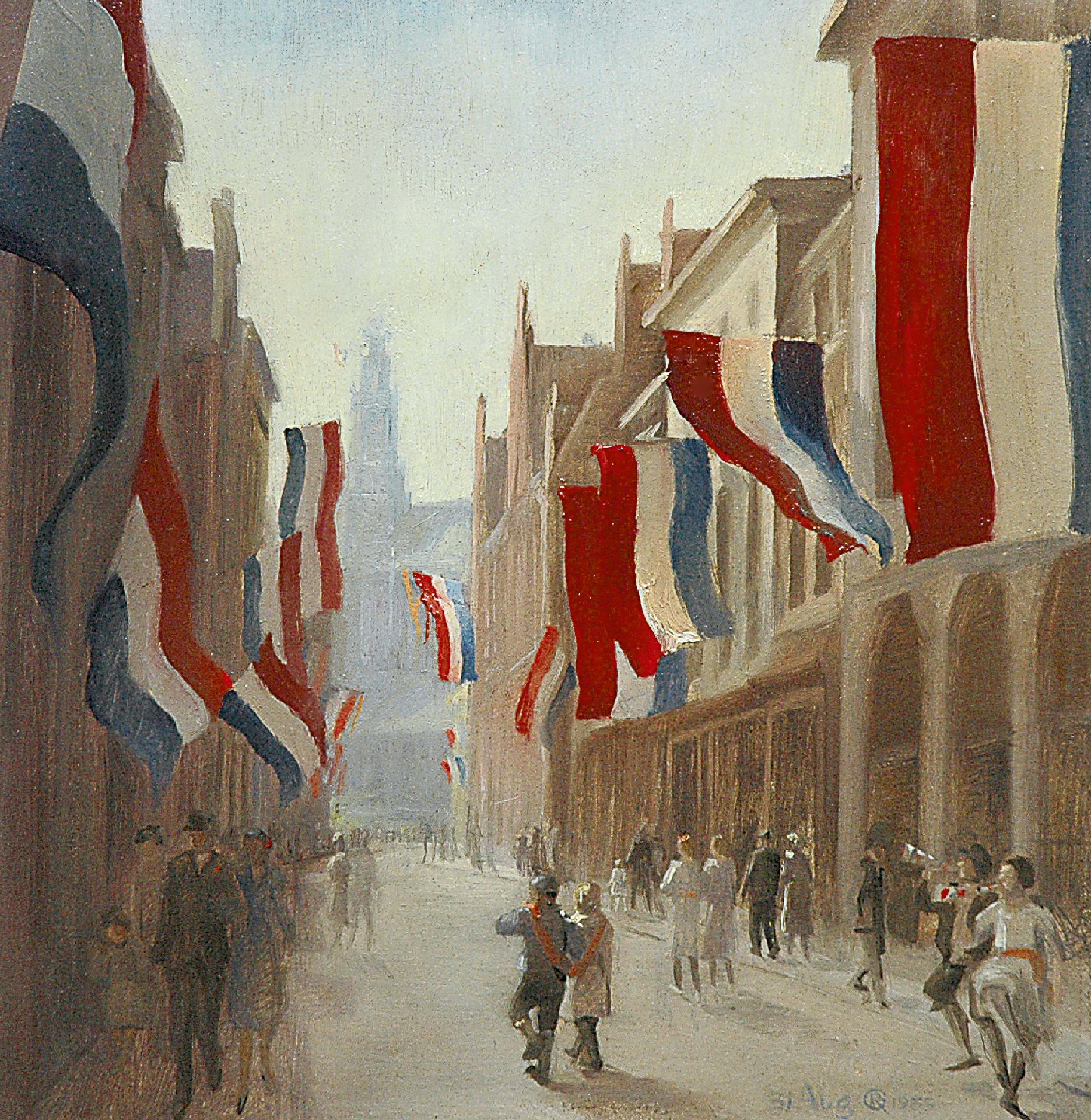 Roelf Gerbrands kunstwerk • schilderij • voorheen te koop Feest in de Jansstraat, Haarlem, voor de geboorte van Prinses Irene op 5 augustus 1939