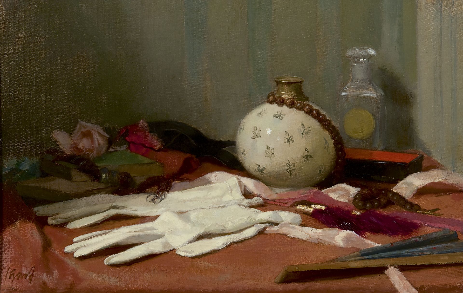 Salomon Garf kunstwerk • schilderij • voorheen te koop Stilleven met witte handschoenen, vaasje en waaier