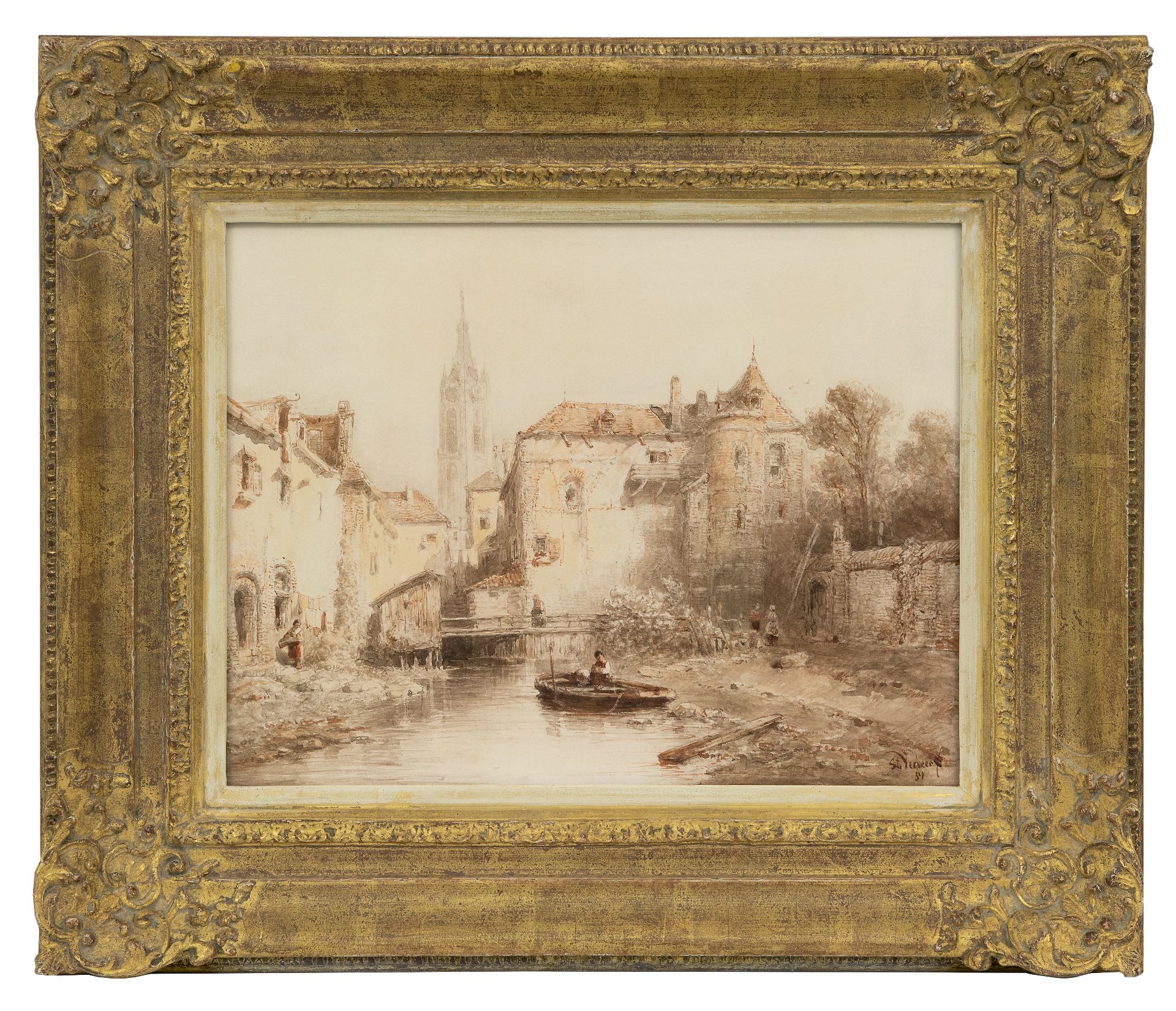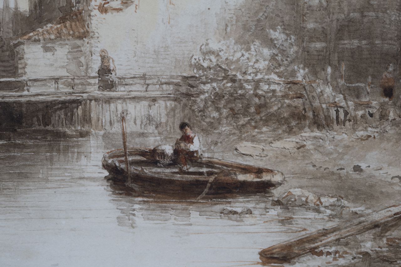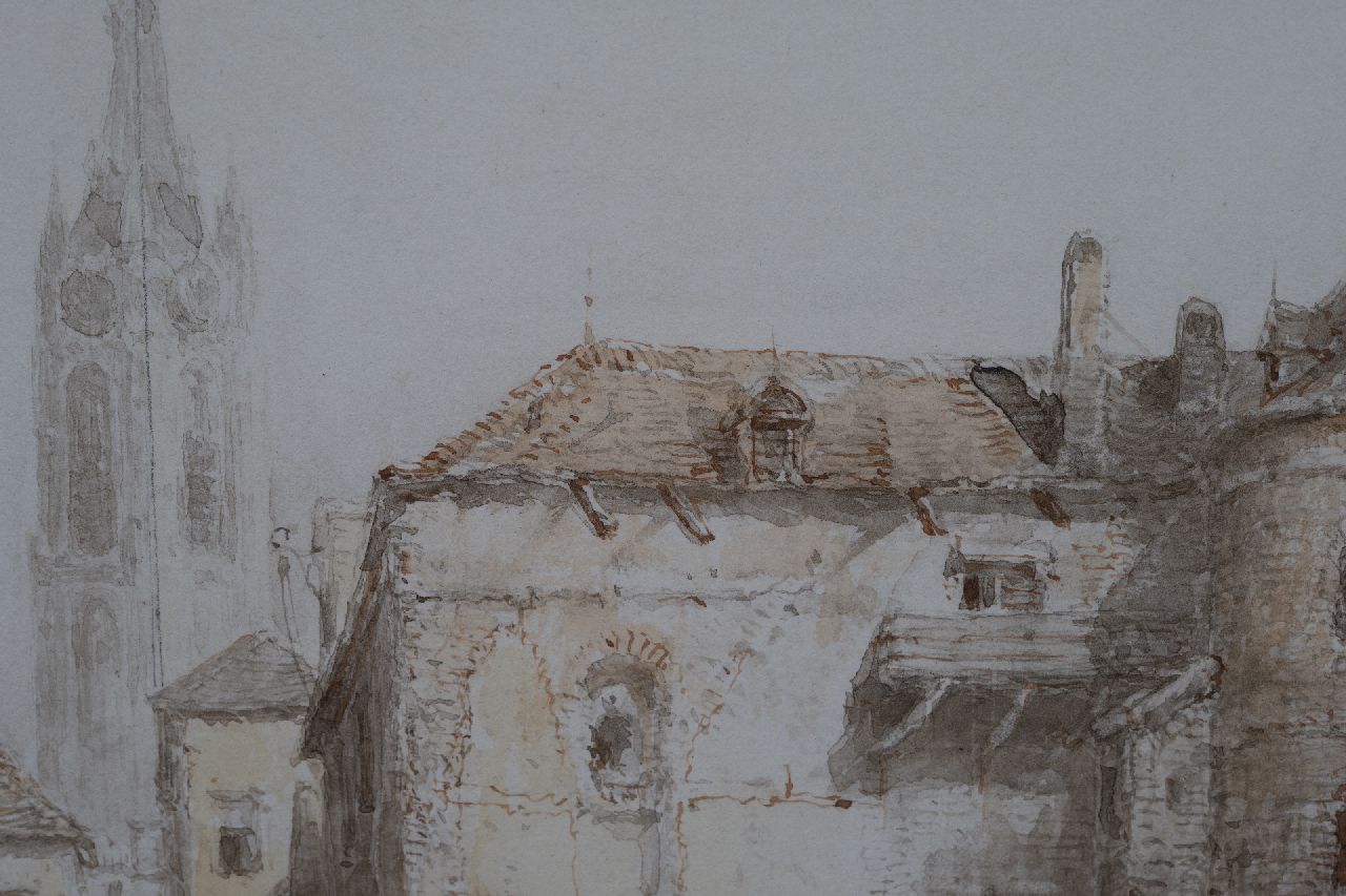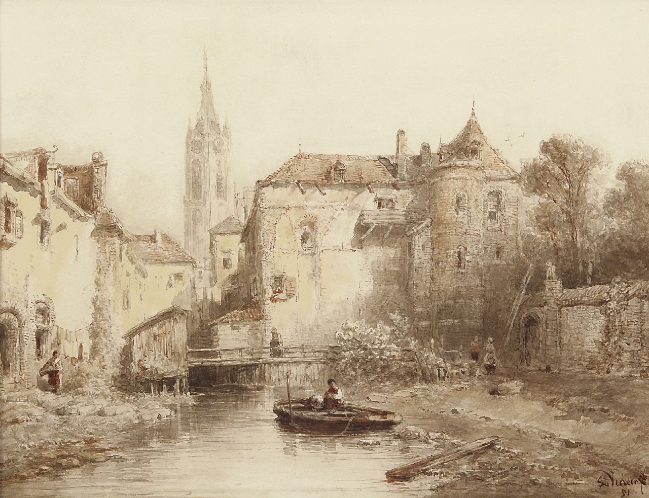 Salomon Verveer kunstwerk • aquarel • tekening • te koop Stadsgezicht met klokkentoren in de verte