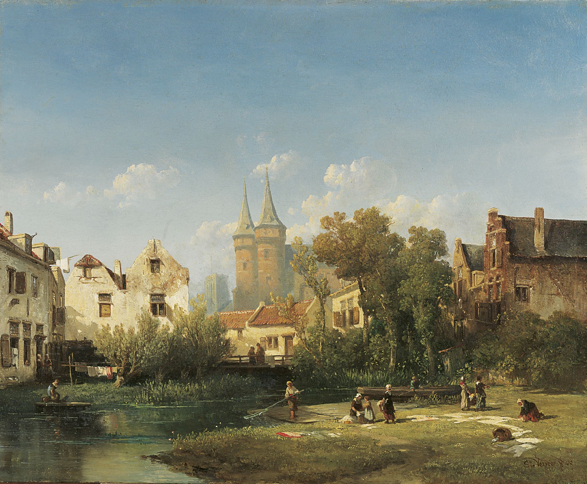 Salomon Verveer kunstwerk • schilderij • voorheen te koop Stadsgezicht met de Oostpoort van Delft