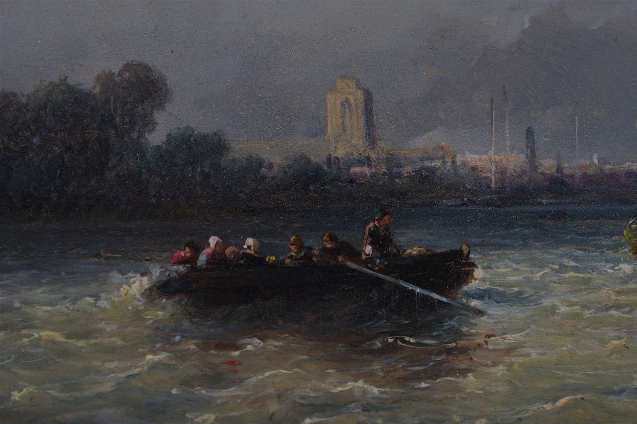 Veer op een woelige rivier, de Grote kerk van Dordrecht in de verte