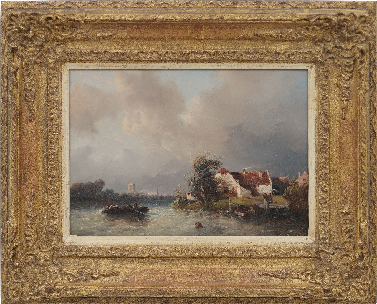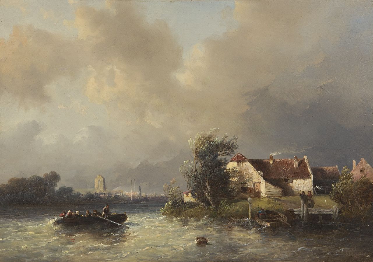 Salomon Verveer kunstwerk • schilderij • te koop Veer op een woelige rivier, de Grote kerk van Dordrecht in de verte