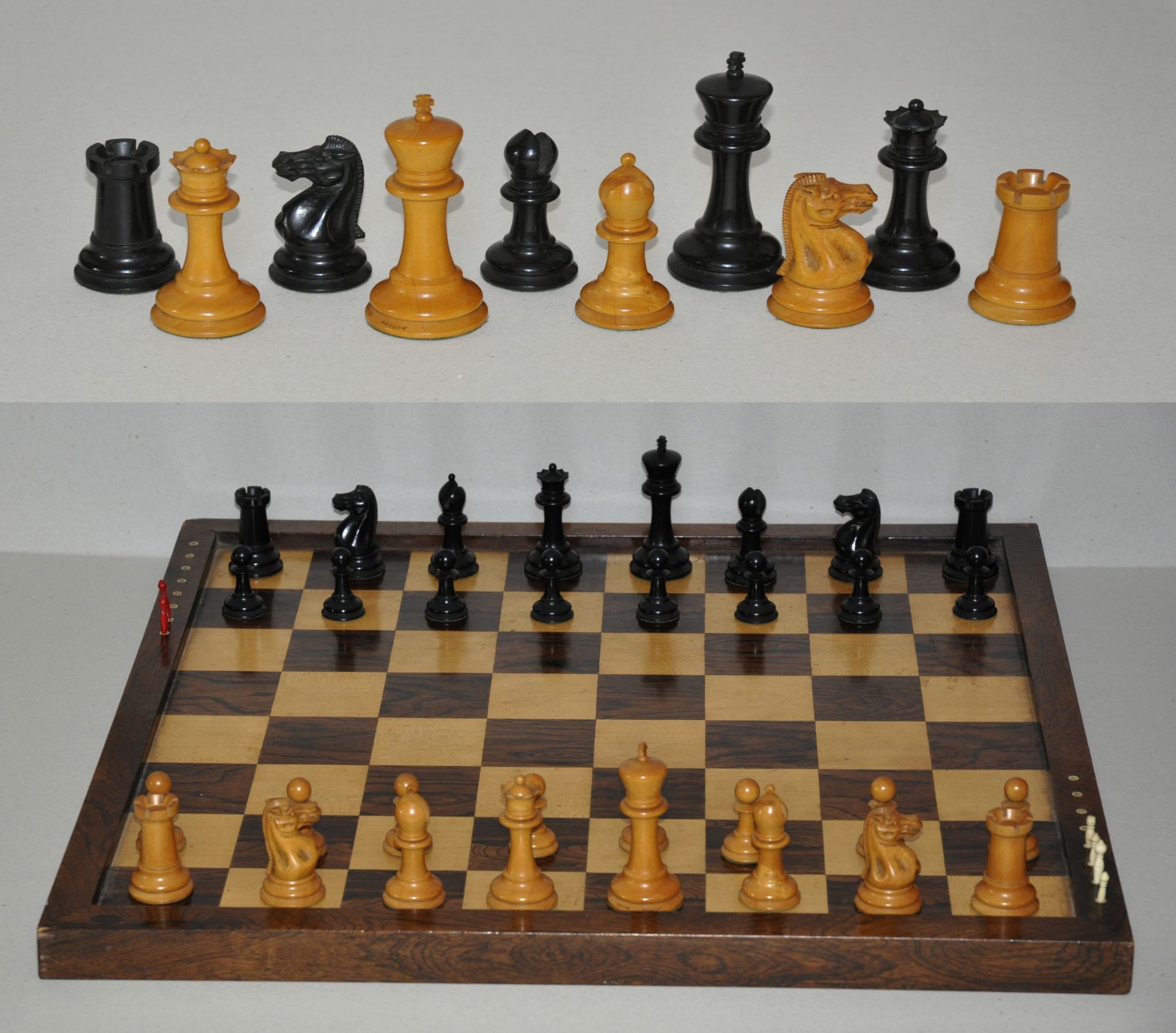 Schaakset, opbergdoos   | Schaakset, opbergdoos | Beelden en objecten te koop aangeboden | Staunton schaakset, verzwaard, met bijbehorende mahoniehouten doos, en schaakbord 67 x 67 cm, palm-, ebben-, rozen- en mahoniehout 11,0 x 5,4 cm, gesigneerd gestempeld 'Jaques London' op voet witte koning en 1852-1855