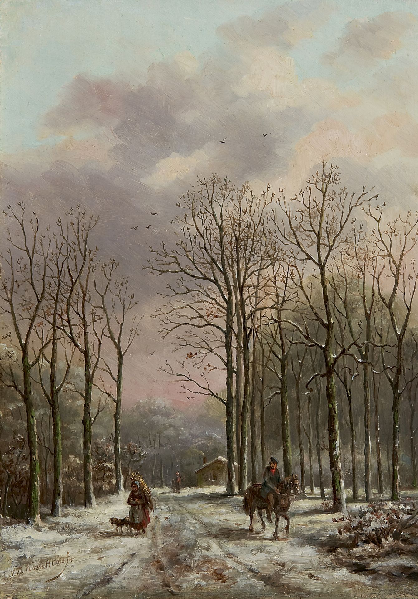 Sebastiaan Theodorus Voorn Boers kunstwerk • schilderij • voorheen te koop Winters bospad met figuren