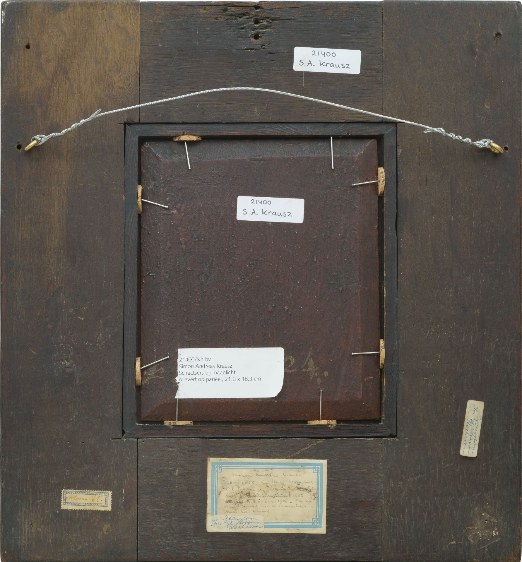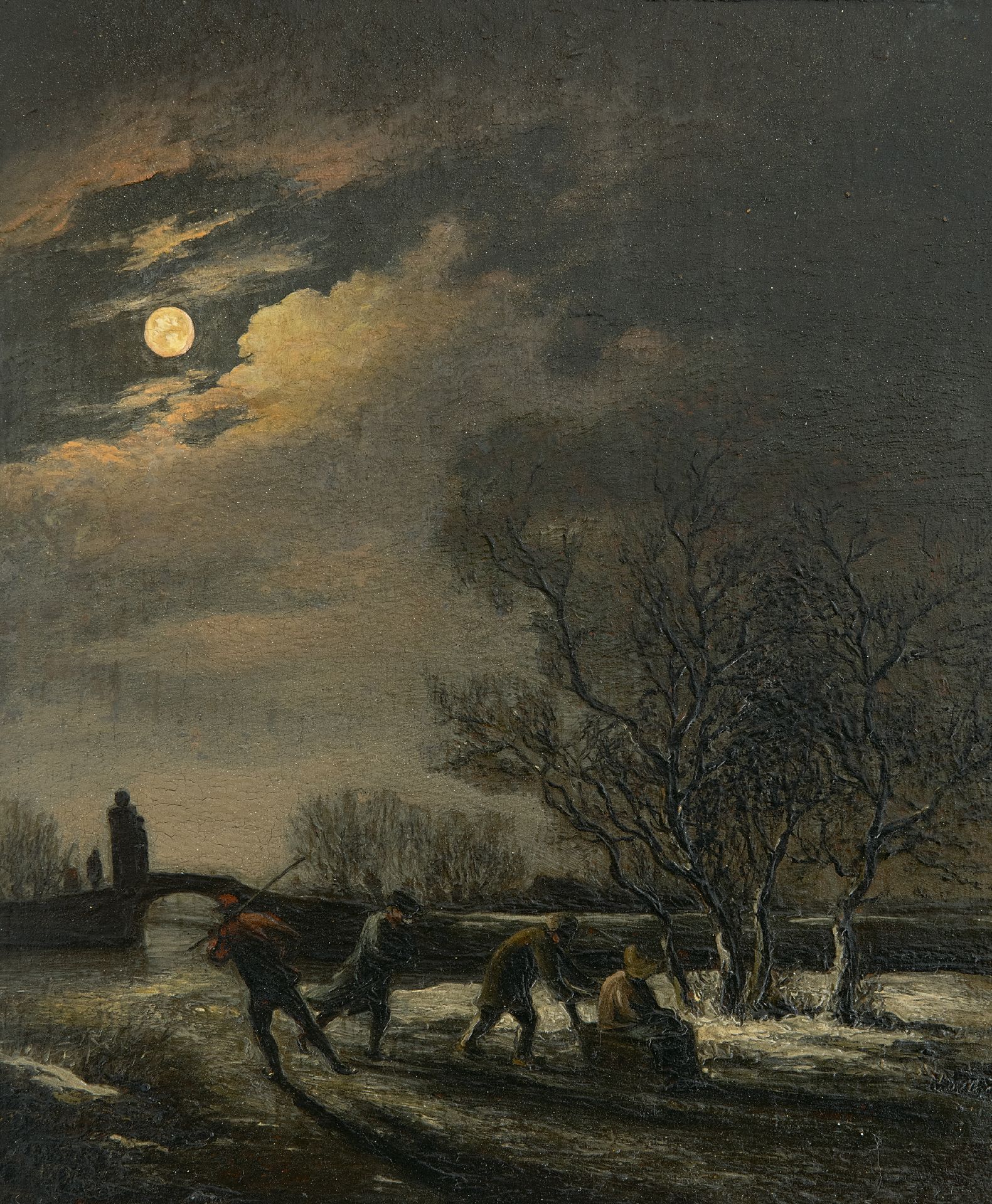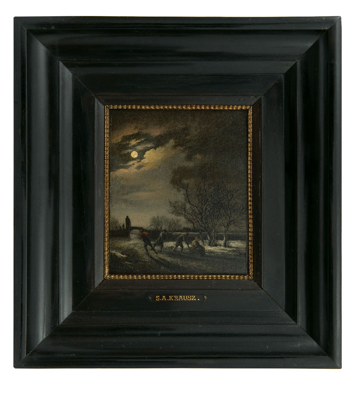 Simon Andreas Krausz kunstwerk • schilderij • voorheen te koop Schaatsers bij maanlicht