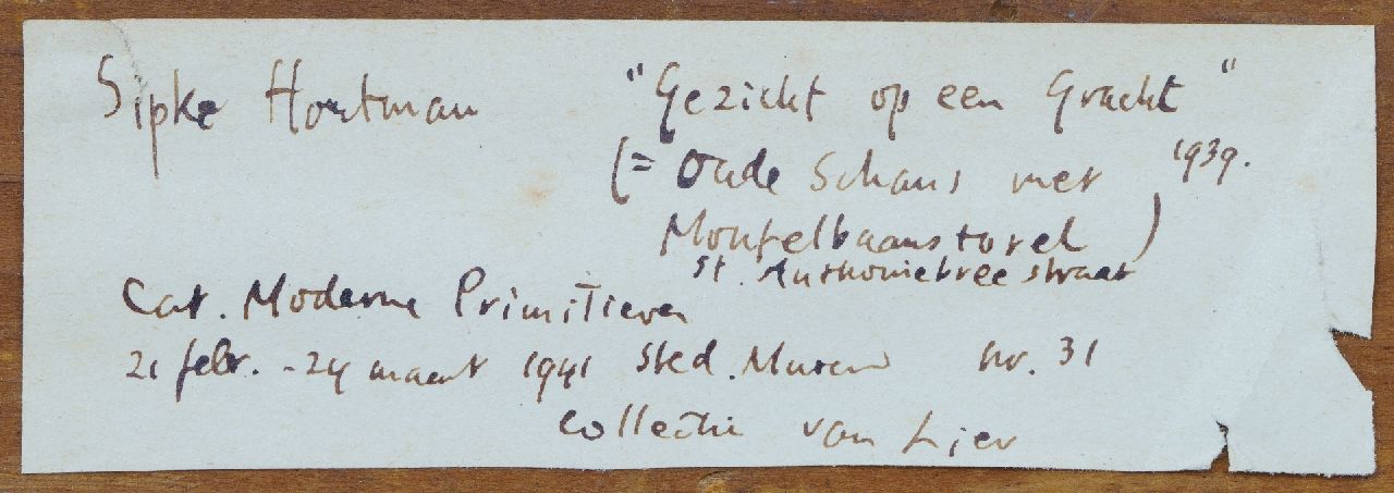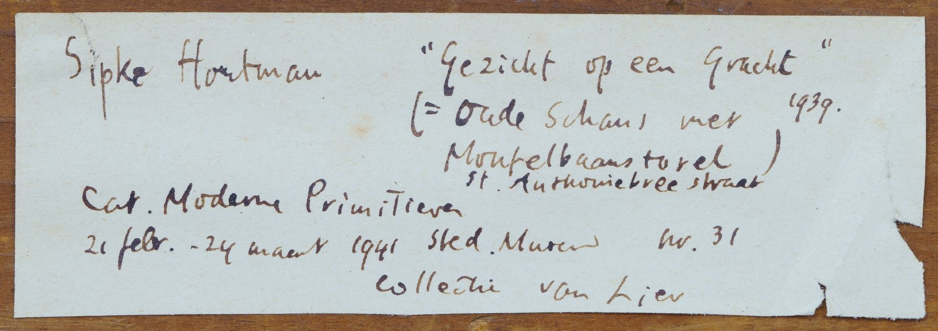 Literatuur: tent.cat. Amsterdam, Stedelijk Museum, 'Moderne Primitieven: werken van 12 Zondagschilders in het Stedelijk Museum', 1941, cat.nr. 31 (als 'Gezicht op een gracht').