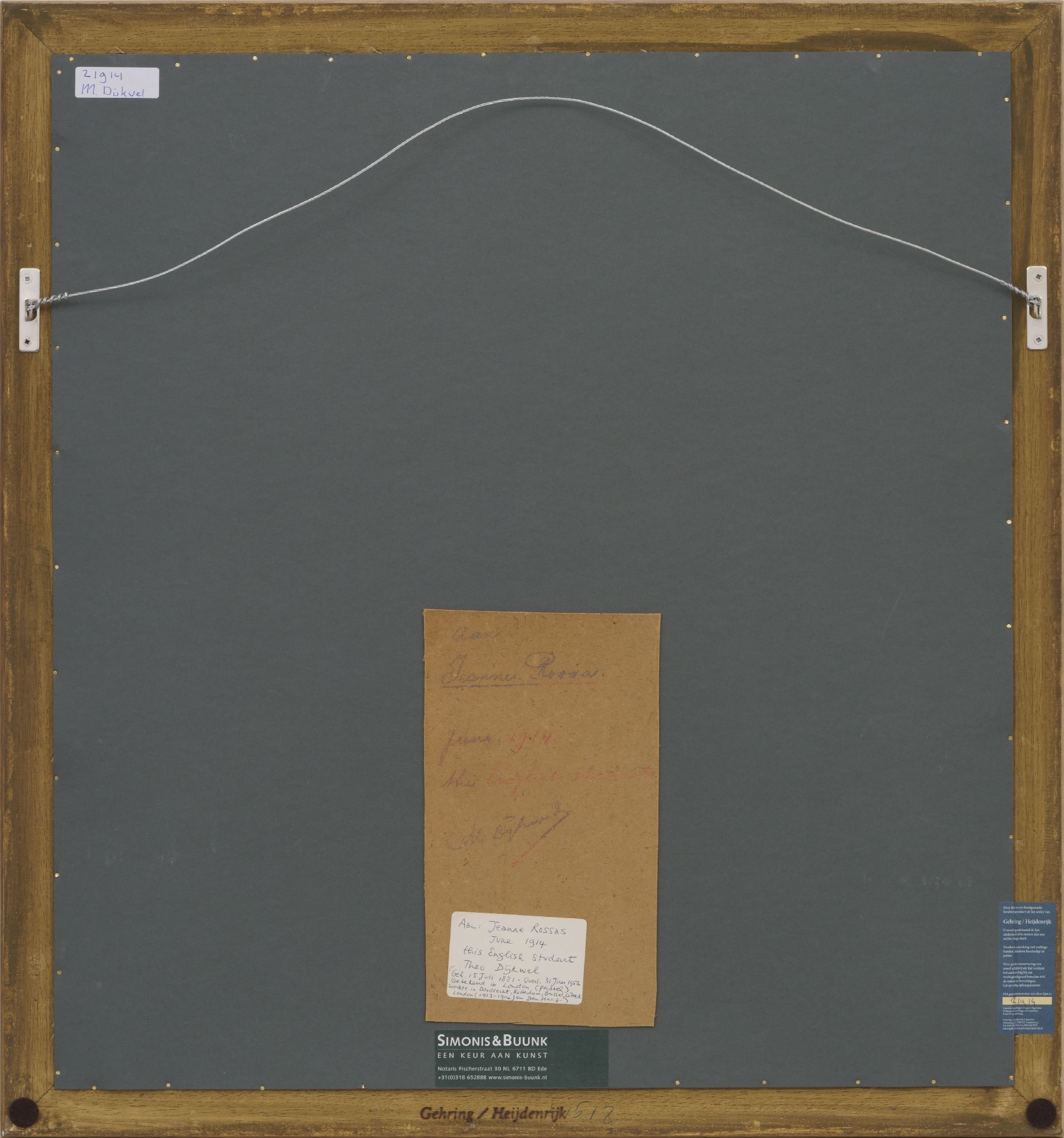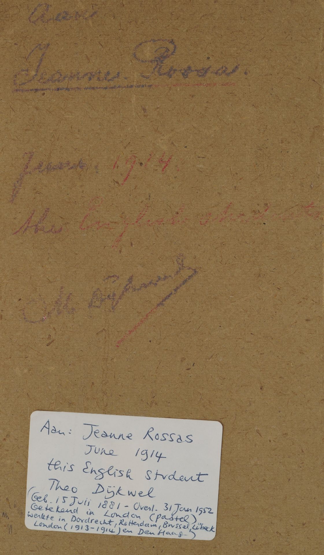 annotatie op steunkarton: 'Aan Jeanne Rossas, June 1914, his english student, Theo Dijkwel'