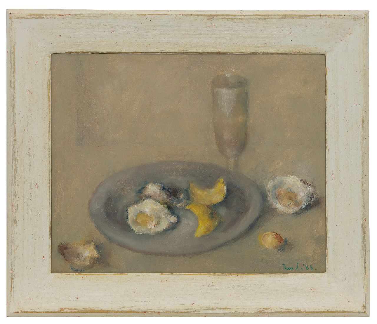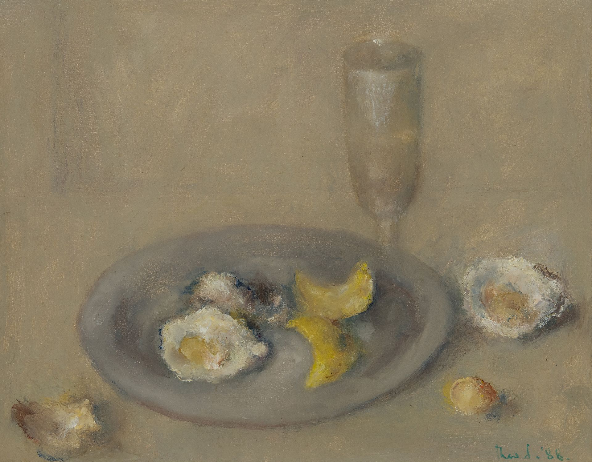 Theo Swagemakers kunstwerk • schilderij • voorheen te koop Stilleven met oesters en citroenschillen op een tinnen bord