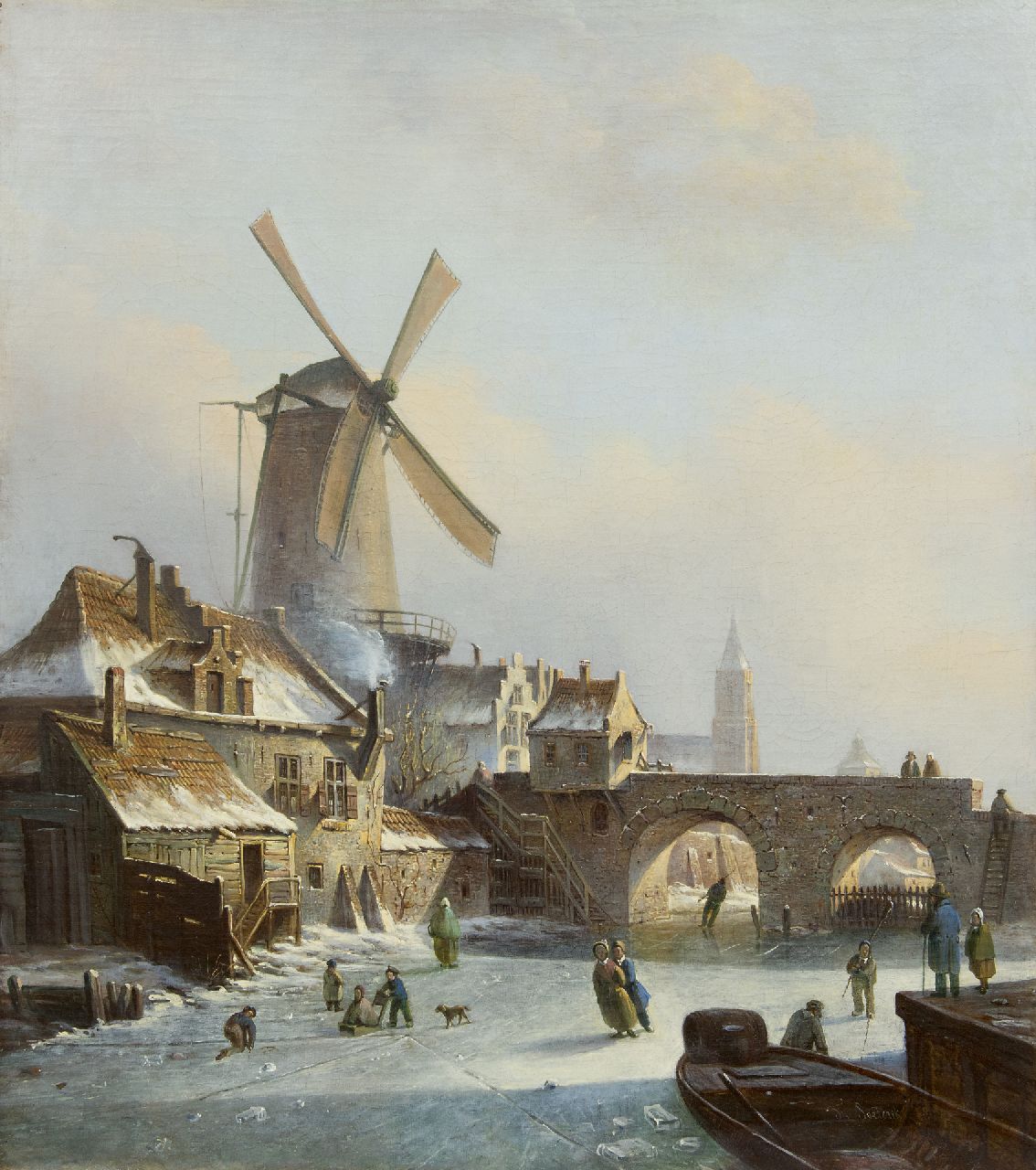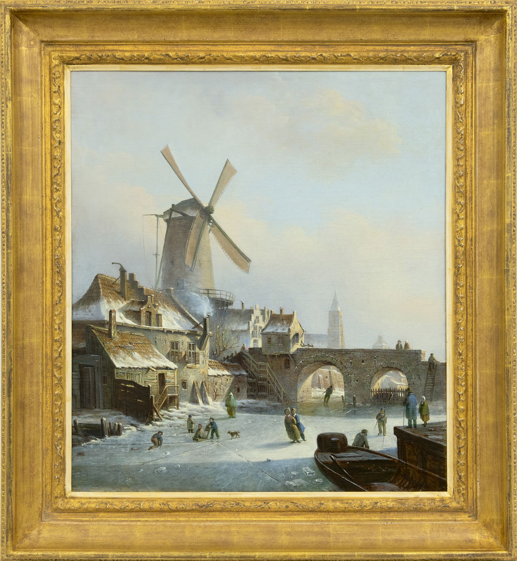 Theodoor Soeterik kunstwerk • schilderij • voorheen te koop Schaatsers op een bevroren buitengracht bij een molen