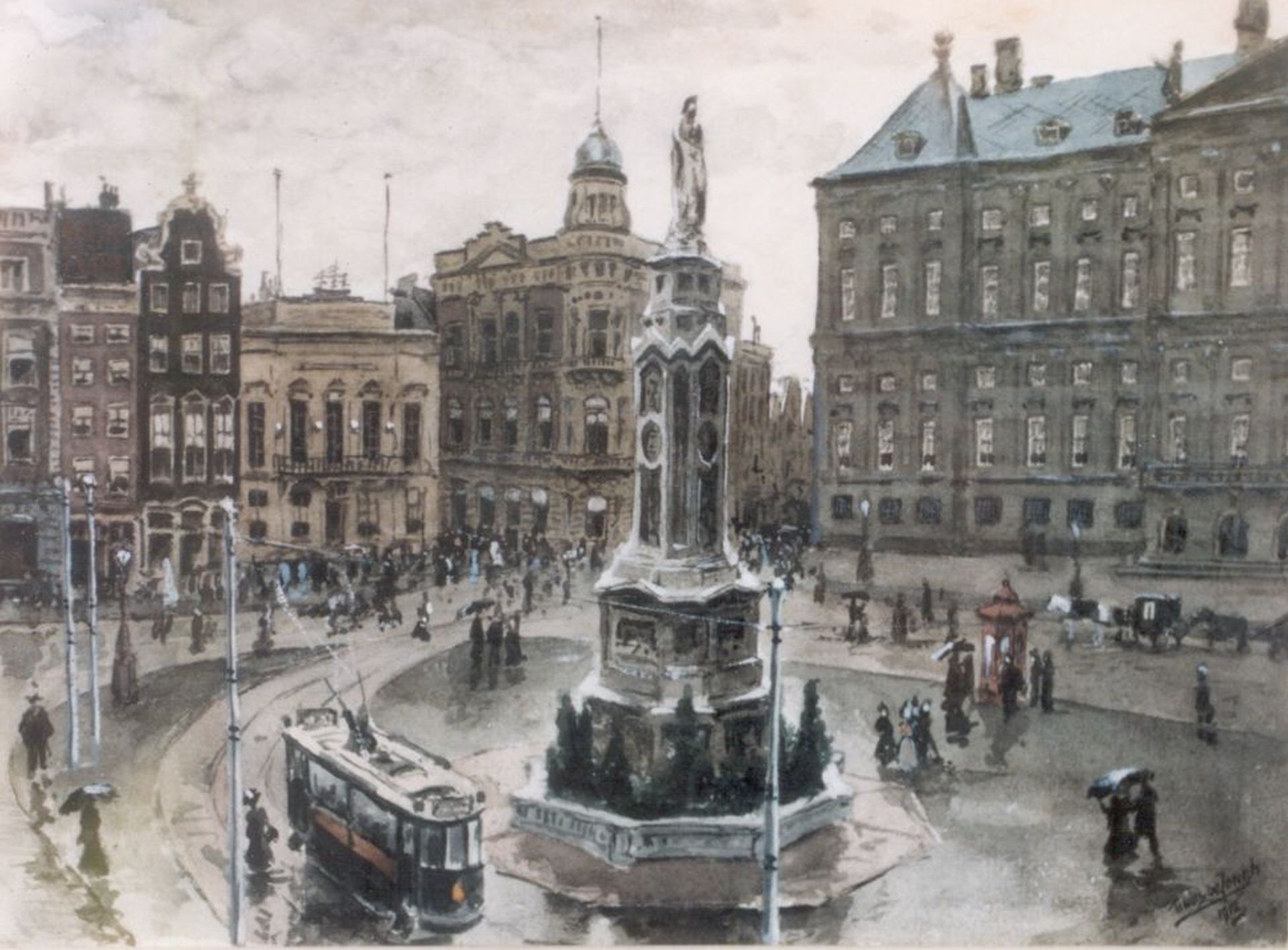 Jongh M.J. de | Martinus Johannes 'Tinus' de Jongh, Gezicht op de Dam, aquarel op papier 16,5 x 22,5 cm, gesigneerd rechtsonder en gedateerd 1912