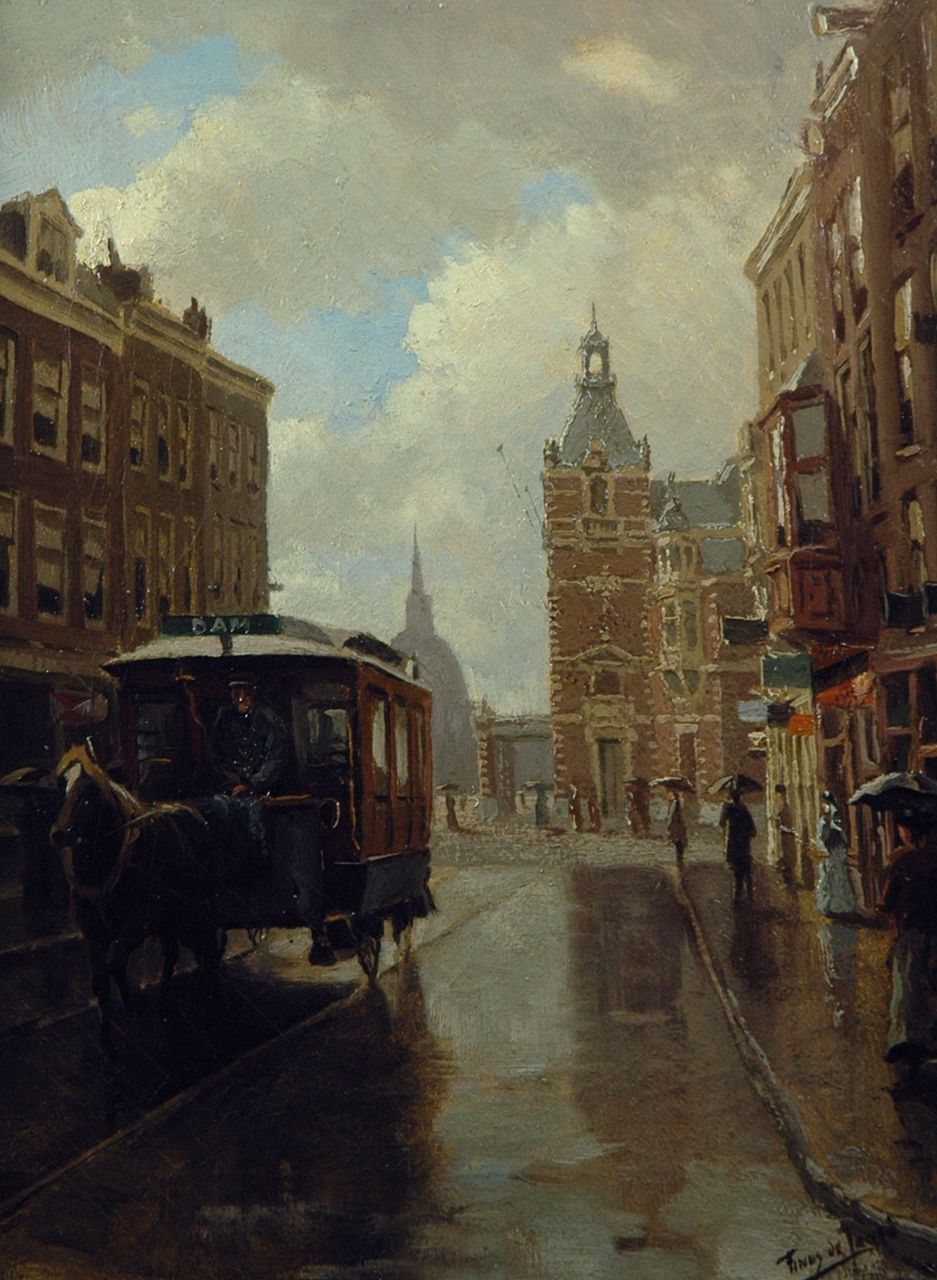 Tinus de Jongh kunstwerk • schilderij • voorheen te koop De Leidsestraat in Amsterdam met de Stadsschouwburg in de verte