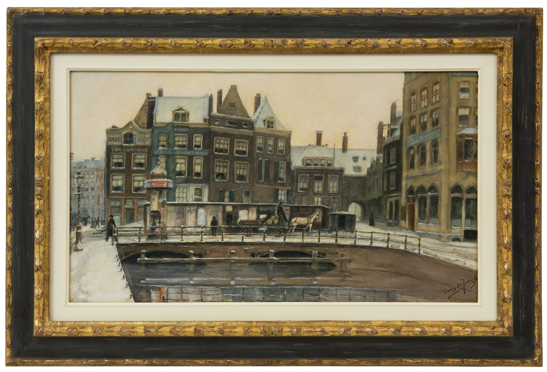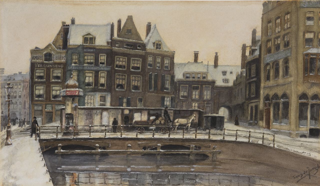Tinus de Jongh kunstwerk • aquarel • tekening • voorheen te koop Winters gezicht op het Rokin met het Beurspoortje, Amsterdam