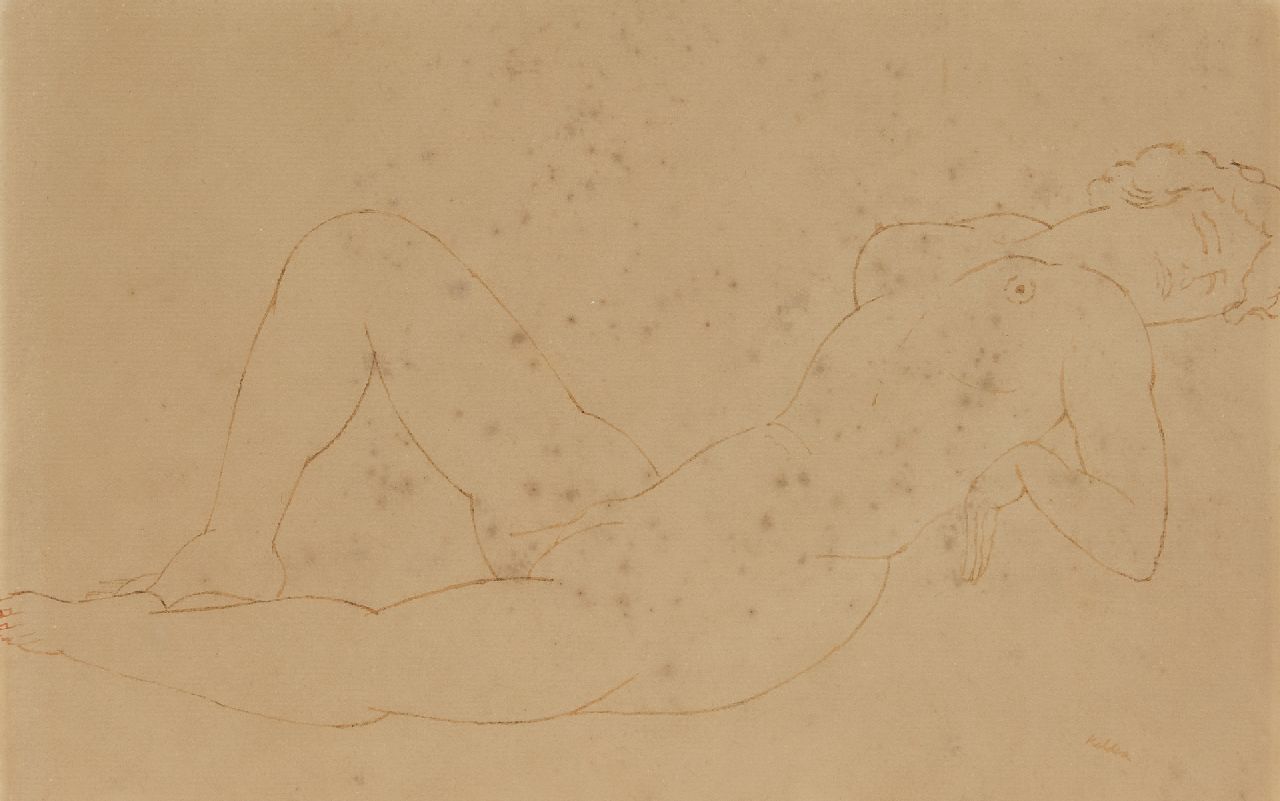 Toon Kelder | Liggend vrouwelijk naakt, pen, inkt, krijt en aquarel op papier, 33,7 x 25,2 cm, gesigneerd l.o.