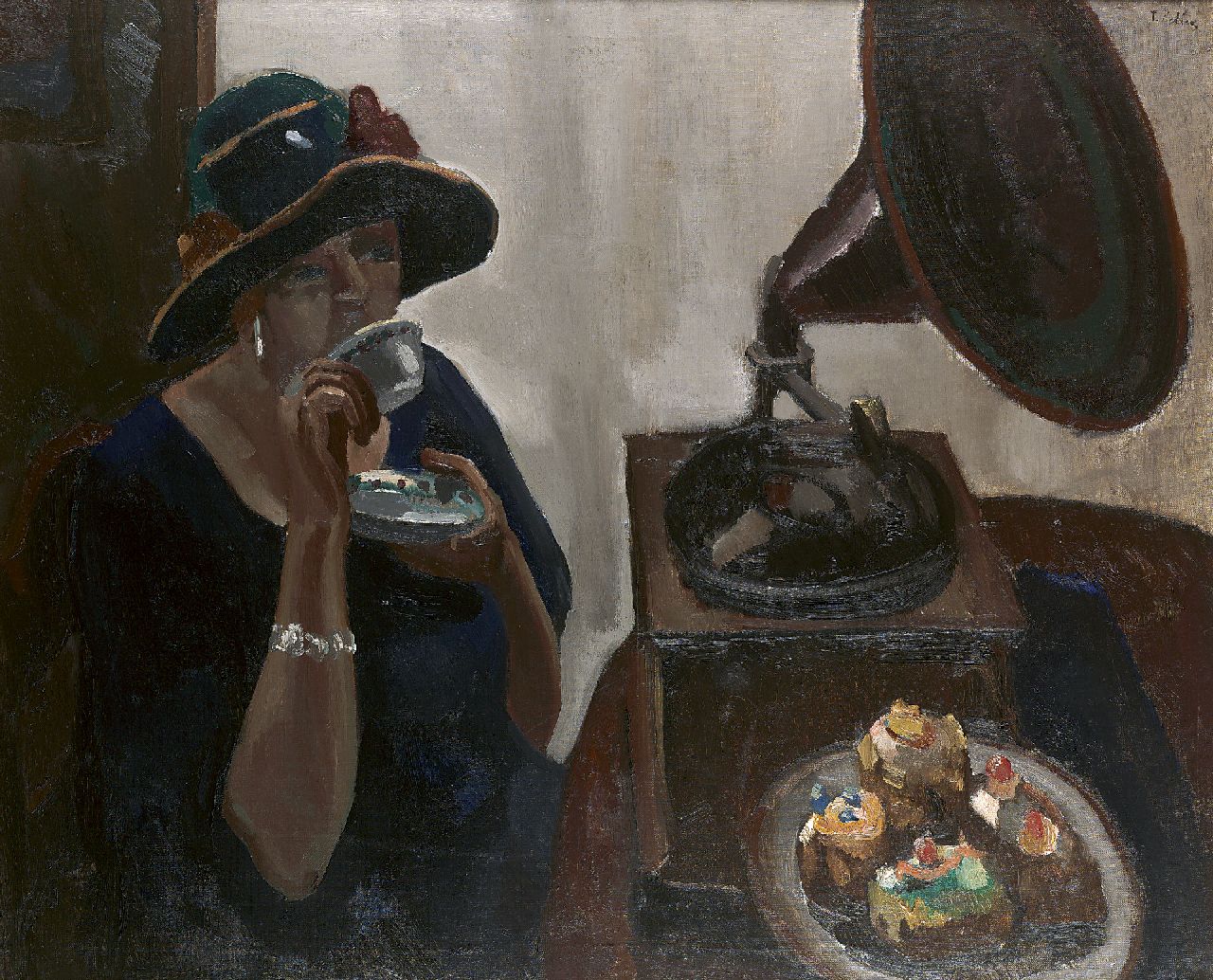 Toon Kelder kunstwerk • schilderij • te koop Theedrinkende dame met gebakjes en grammofoon