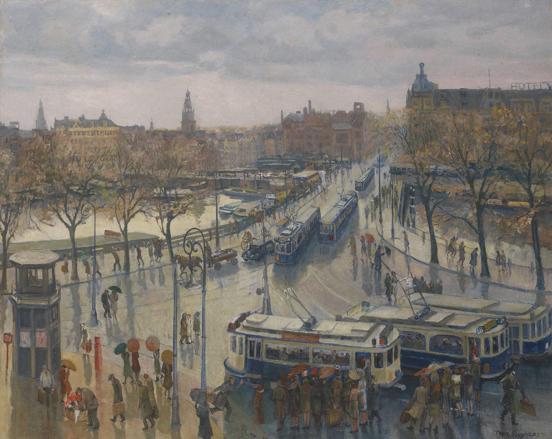 Toon Pluijmers kunstwerk • schilderij • voorheen te koop Stationsplein met het Damrak in Amsterdam