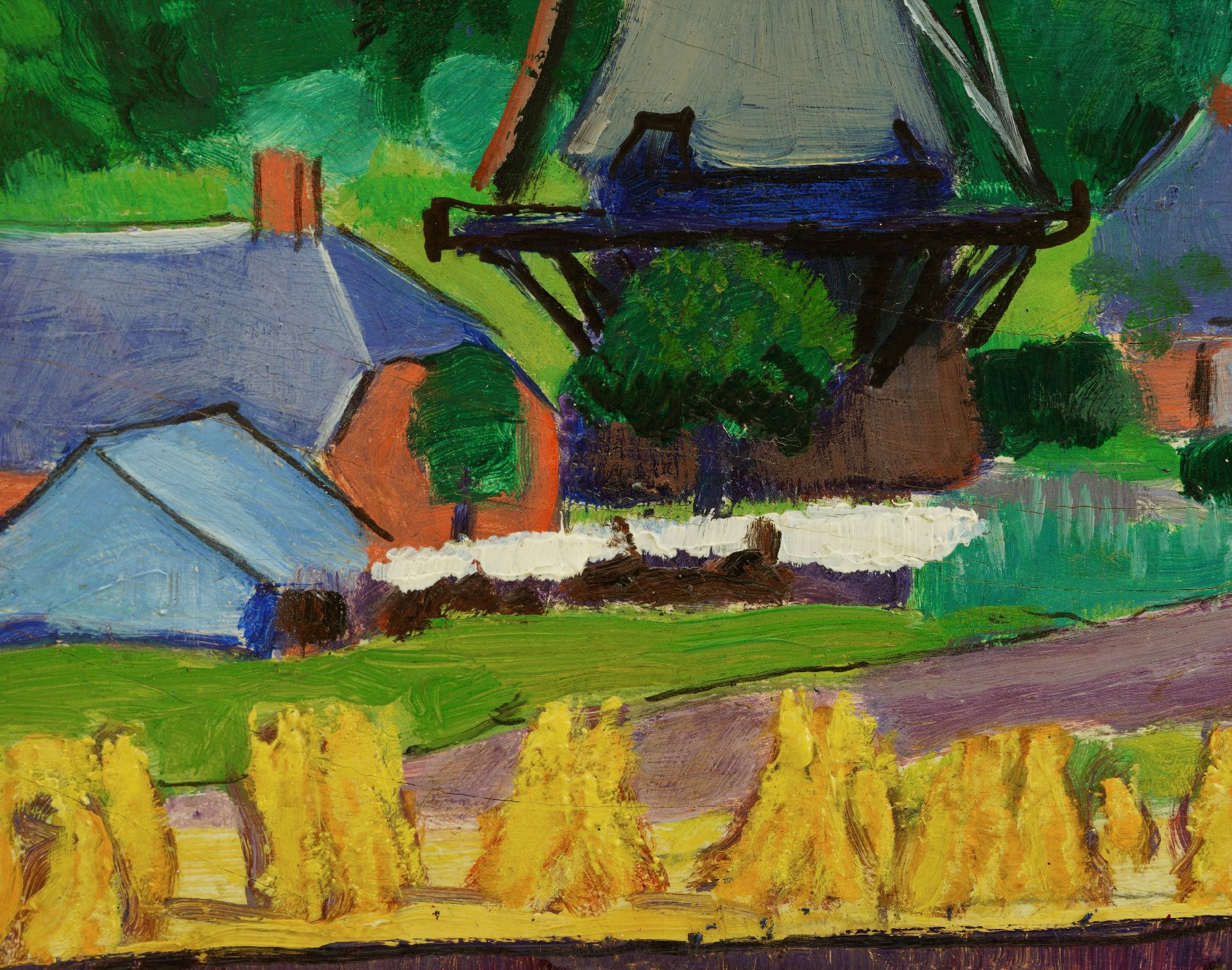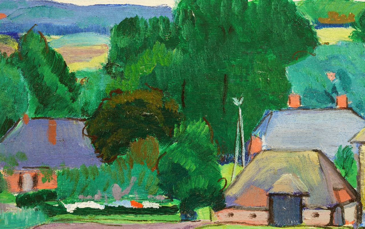 Vilmos Huszár kunstwerk • schilderij • te koop Boerderijen in een glooiend landschap
