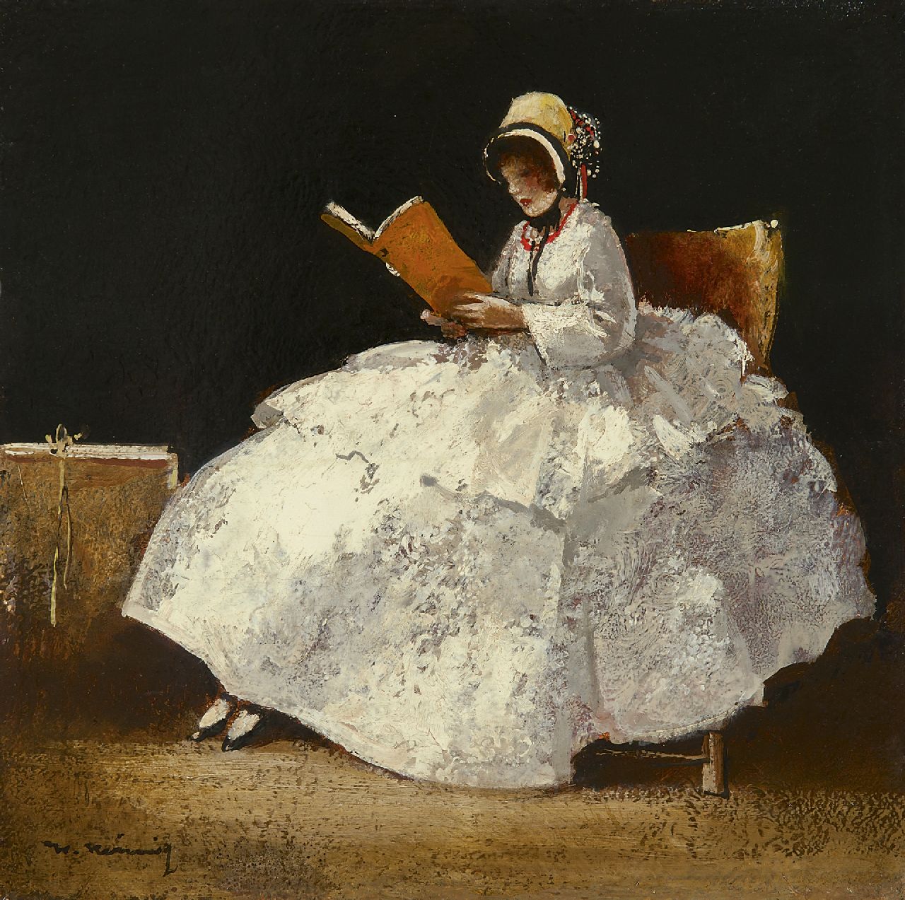 Walter Heimig kunstwerk • schilderij • voorheen te koop Lezend meisje met kaphoedje