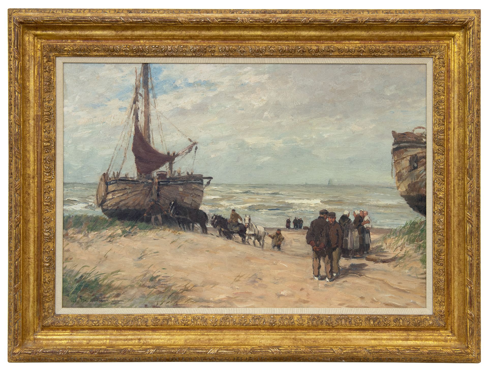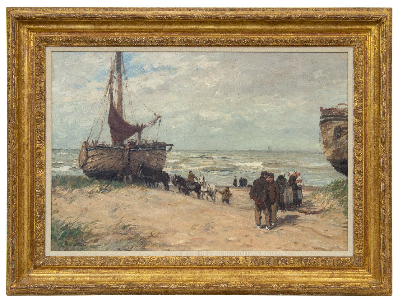 Wilhem Hambüchen kunstwerk • schilderij • voorheen te koop Bommen en vissersvolk op het strand van Katwijk