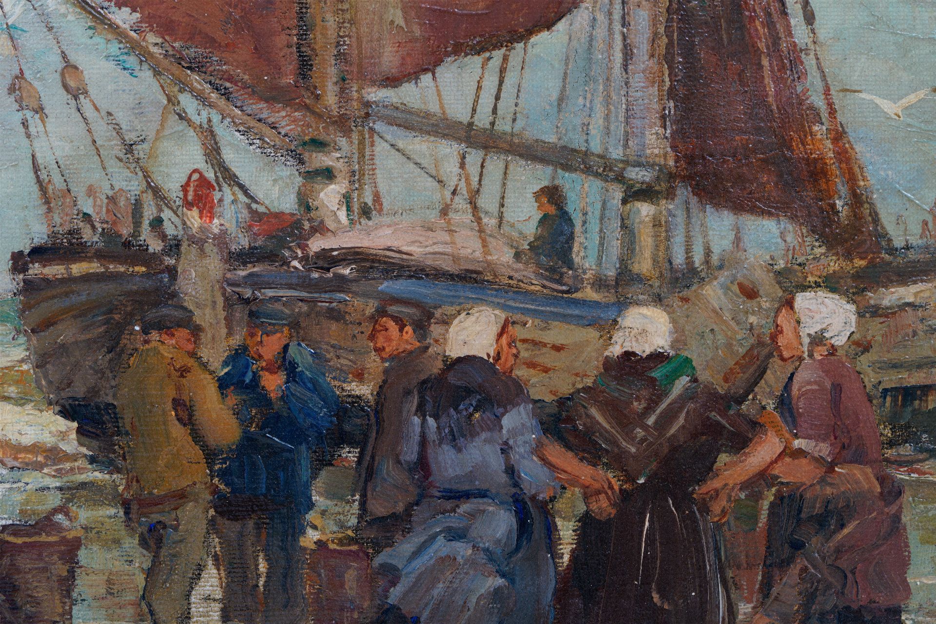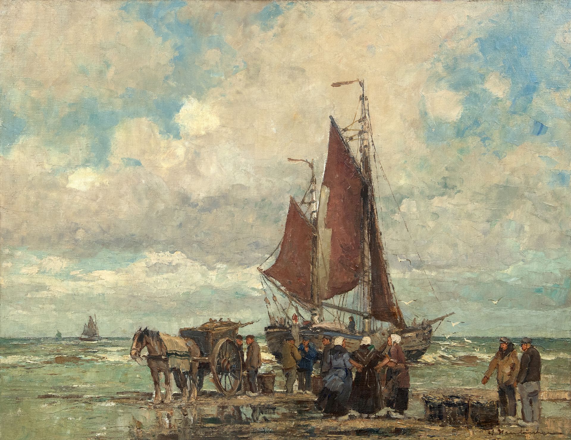 Bomschuiten, de visafslag op het strand en de zee bij Katwijk zijn enkele van de favoriete onderwerpen van schilder Wilhelm Hambüchen. In de voetsporen van tal van andere Duitse kunstenaars maakte hij kort na 1900 zijn eerste reis naar deze populaire Nederlandse badplaats om het pittoreske lokale vissersleven te schilderen. Elke zomer kwam hij terug voor een ongelooflijke periode van 50 jaar. Onvermoeibaar en met brede, behendige penseelstreken schilderde hij de opvallende vissersboten, het vlakke strand onder de hemel met overdrijvende wolken en de levendige groepen mensen die zich verzamelden nadat de boten terugkeerden met de vangst van de dag.