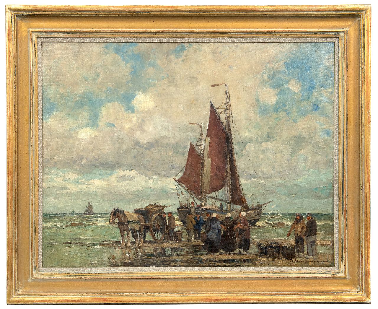 Wilhem Hambüchen kunstwerk • schilderij • voorheen te koop Bomschuit en vissers op het strand van Katwijk