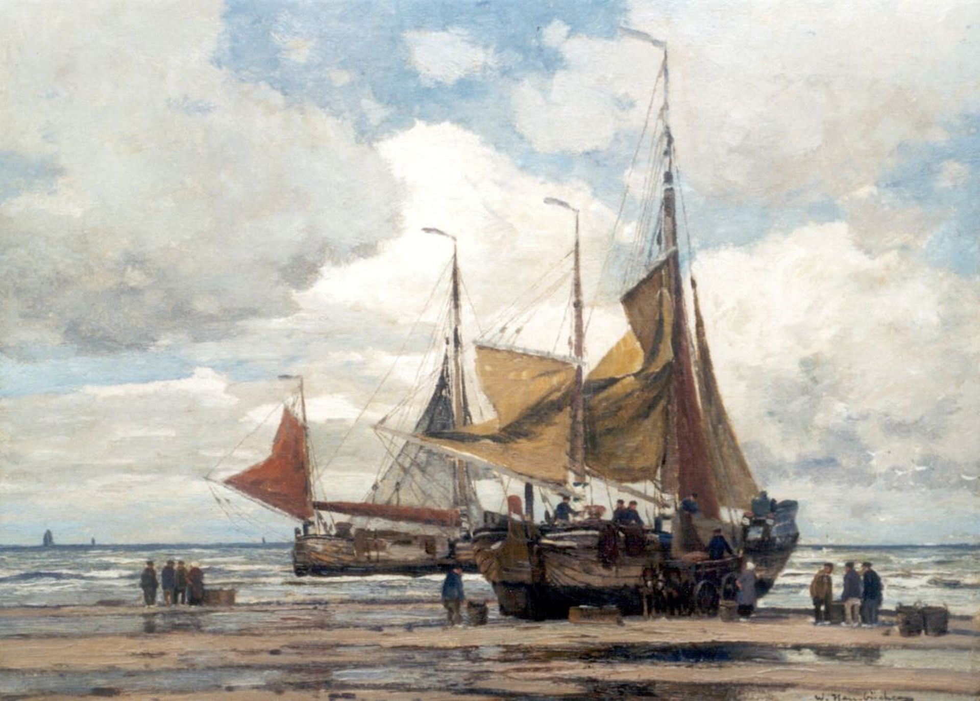 Wilhem Hambüchen kunstwerk • schilderij • voorheen te koop Bomschuiten aan het strand