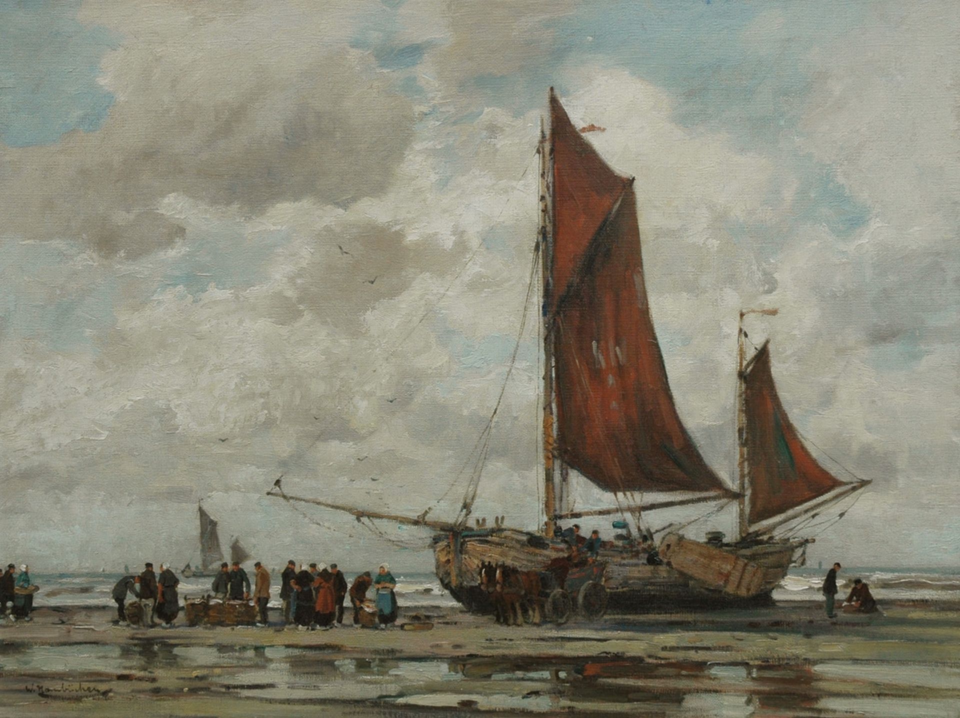 Wilhem Hambüchen kunstwerk • schilderij • voorheen te koop Het uitladen van de vangst