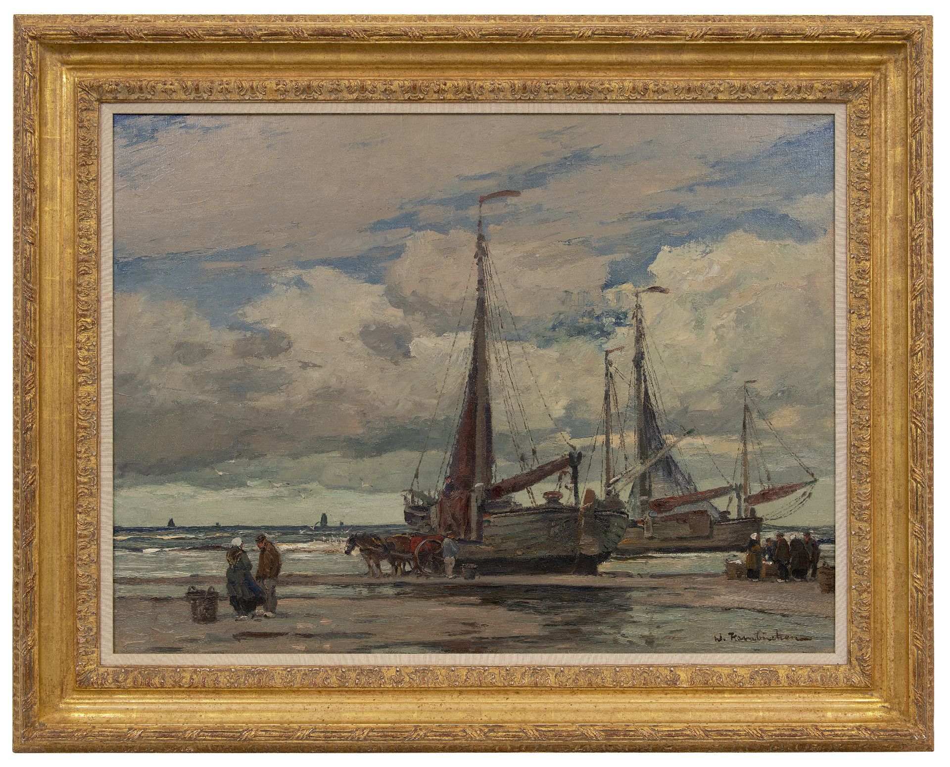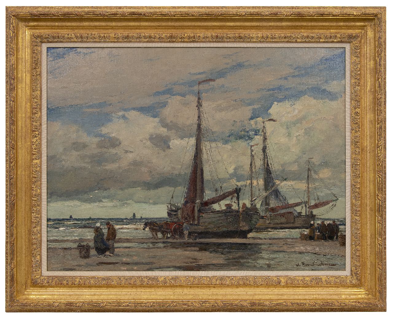 Bomschuiten, de visafslag op het strand en de zee bij Katwijk zijn enkele van de favoriete onderwerpen van schilder Wilhelm Hambüchen. In de voetsporen van tal van andere Duitse kunstenaars maakte hij kort na 1900 zijn eerste reis naar deze populaire Nederlandse badplaats om het pittoreske lokale vissersleven te schilderen. Elke zomer kwam hij terug voor een ongelooflijke periode van 50 jaar. Onvermoeibaar en met brede, behendige penseelstreken schilderde hij de opvallende vissersboten, het vlakke strand onder de hemel met overdrijvende wolken en de levendige groepen mensen die zich verzamelden nadat de boten terugkeerden met de vangst van de dag.