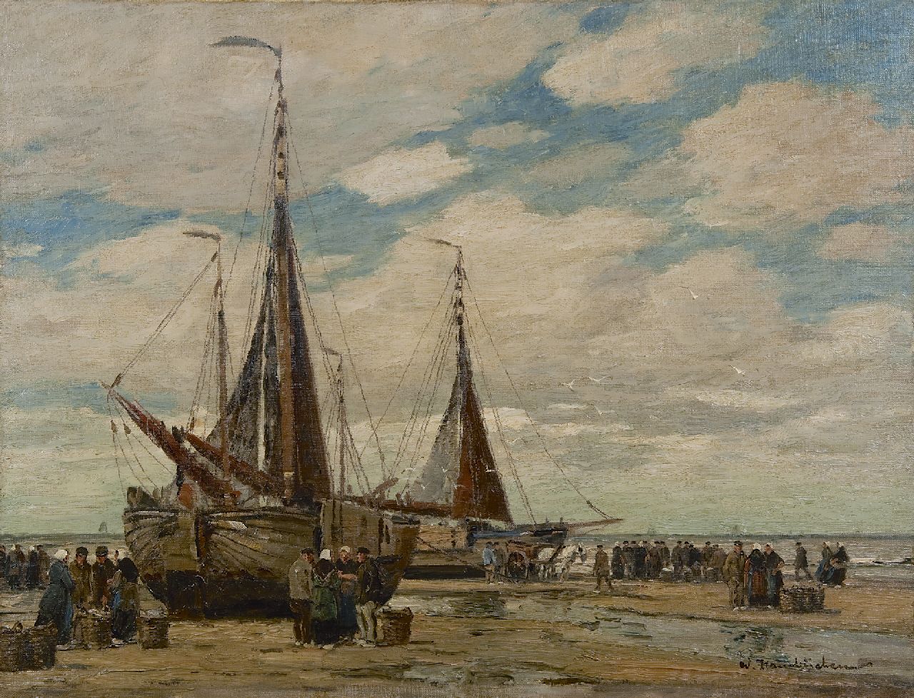 Wilhem Hambüchen kunstwerk • schilderij • voorheen te koop Visafslag op het strand van Katwijk