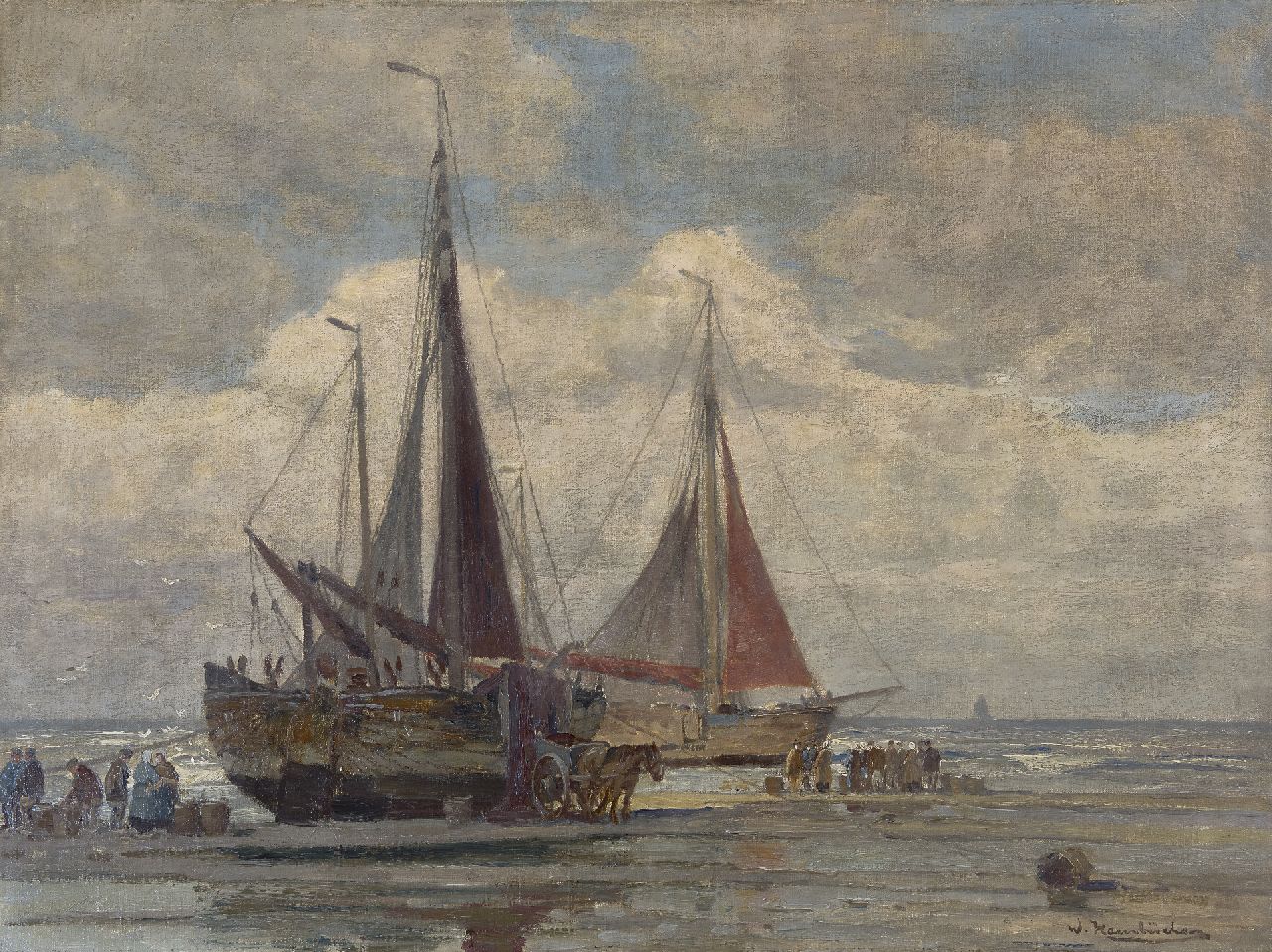 Wilhem Hambüchen kunstwerk • schilderij • te koop Visafslag op het strand van Katwijk