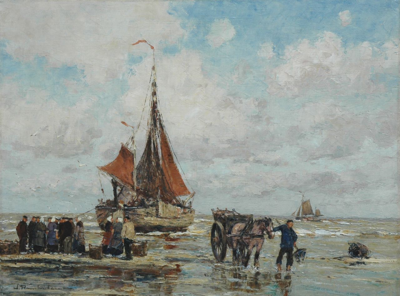 Bomschuiten, de visafslag op het strand en de zee bij Katwijk zijn enkele van de favoriete onderwerpen van schilder Wilhelm Hambüchen. In de voetsporen van tal van andere Duitse kunstenaars maakte hij kort na 1900 zijn eerste reis naar deze populaire Nederlandse badplaats om het pittoreske lokale vissersleven te schilderen. Elke zomer kwam hij terug voor een ongelooflijke periode van 50 jaar. Onvermoeibaar en met brede, behendige penseelstreken schilderde hij de opvallende vissersboten, het vlakke strand onder de hemel met overdrijvende wolken en de levendige groepen mensen die zich verzamelden nadat de boten terugkeerden met de vangst van de dag.