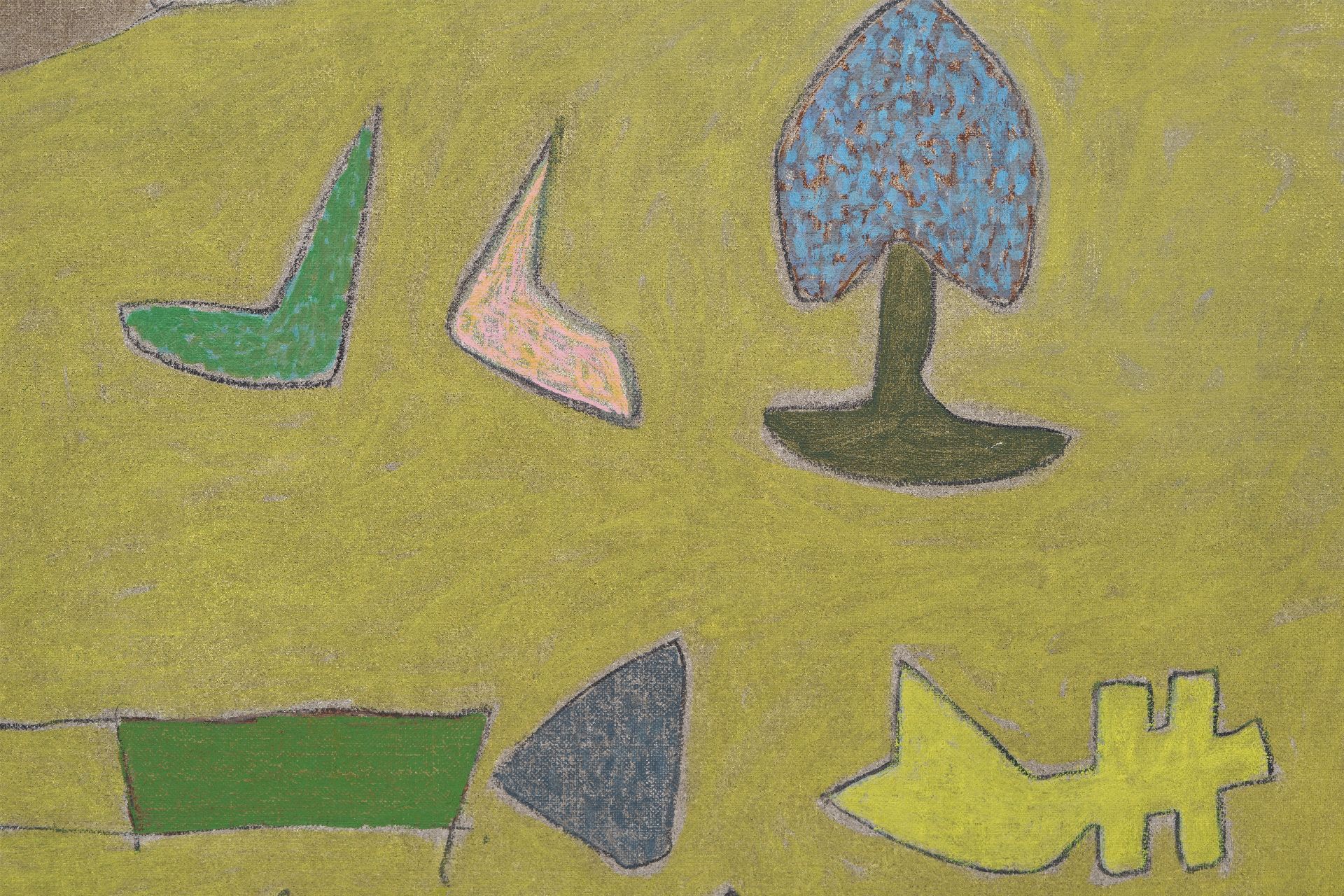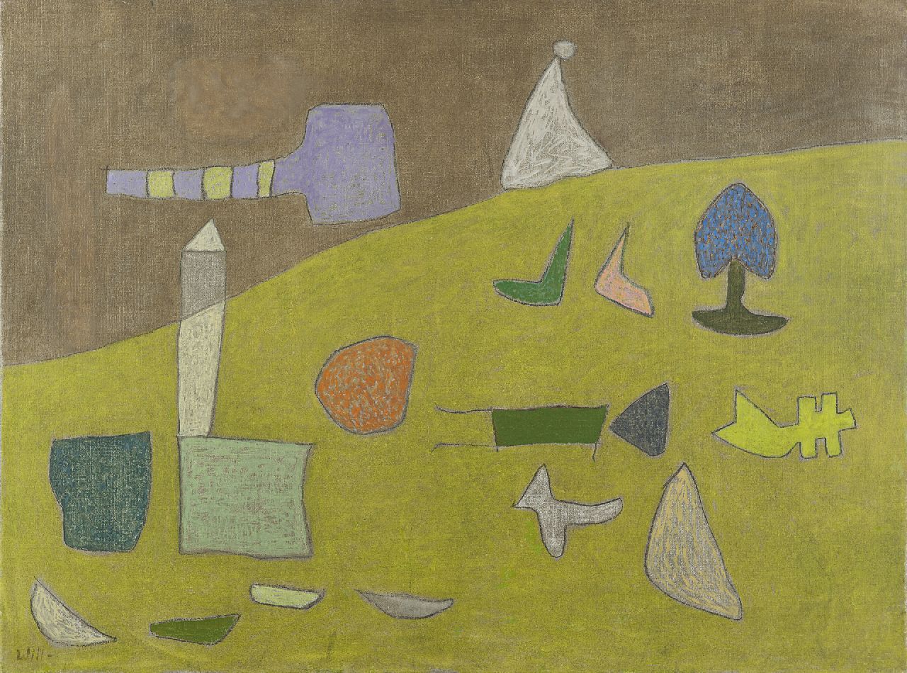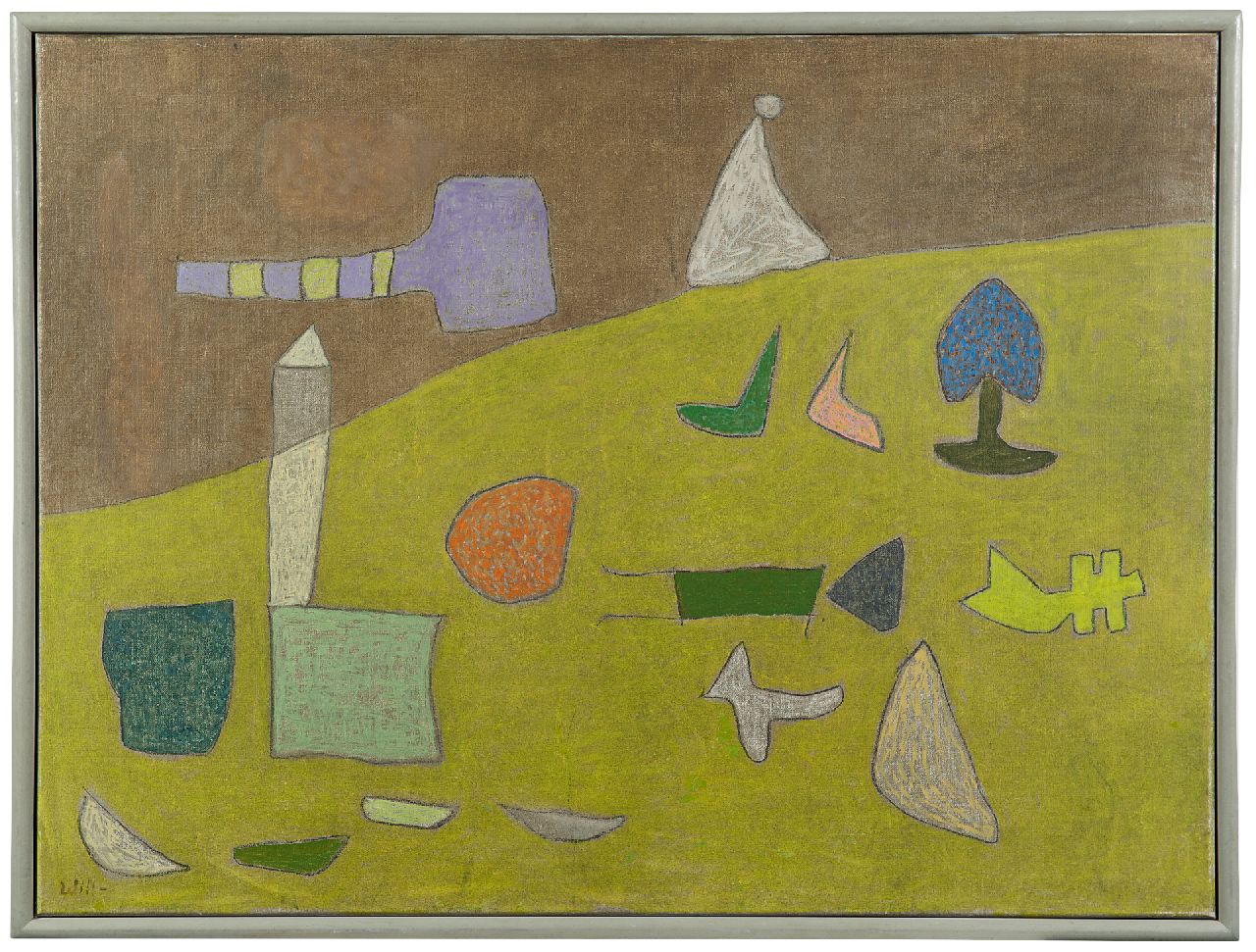Will Leewens kunstwerk • schilderij • te koop Figuren in groen landschap