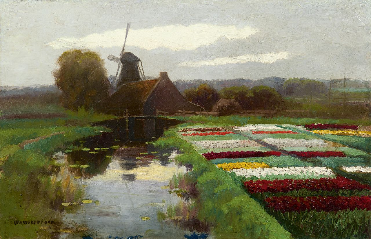 Willem Abraham Wassenaar kunstwerk • schilderij • voorheen te koop Tulpenvelden bij een molen