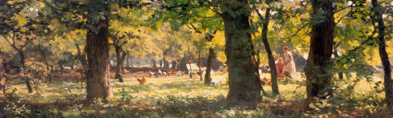 Willem Bastiaan Tholen kunstwerk • schilderij • voorheen te koop Kinderen voeren de kippen in zonnig bos