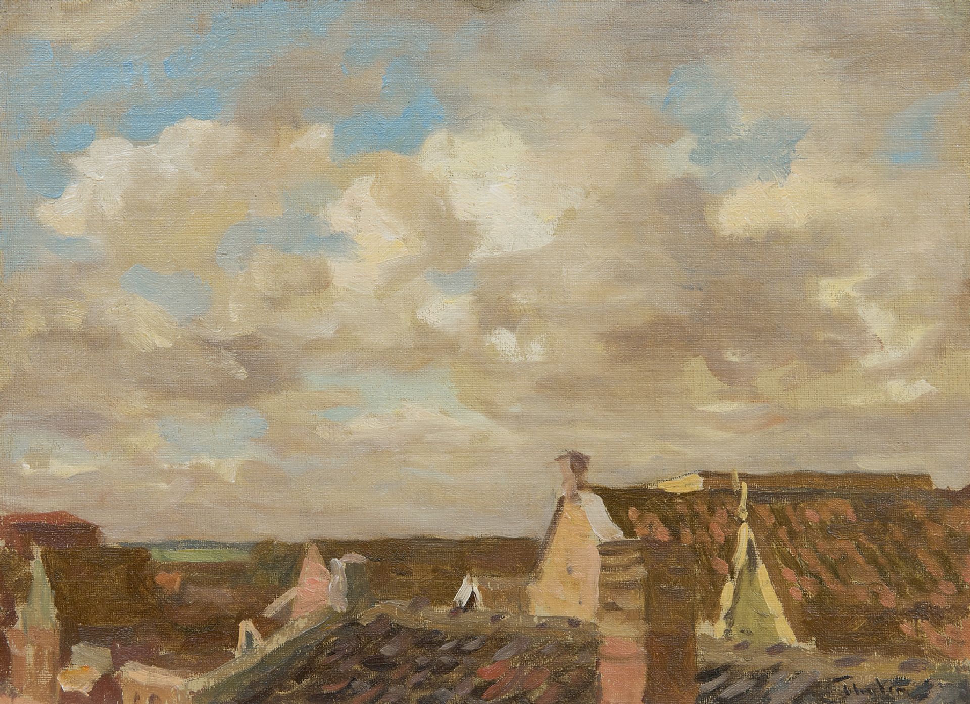 Tholen W.B.  | Willem Bastiaan Tholen, Uitzicht over daken, olieverf op doek op paneel 23,0 x 31,7 cm, gesigneerd rechtsonder