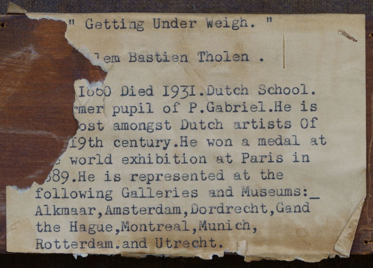 Willem Bastiaan Tholen was een leerling van onder anderen Paul Joseph Constantin Gabriel, wiens invloed zichtbaar is in de vroege landschappen die hij in de omgeving van Giethoorn en Kampen maakte. Daarna schilderde hij vooral portretten, bos-, stads- en strandgezichten in een losse schildertrant en kleurig helder palet. Na 1895 maakte Tholen met zijn Lemsteraak 'Eudia' zwerftochten over de Zuiderzee, Zeeuwse wateren en Hollandse rivieren. Uit die tijd stammen talloze haven- en watergezichten.