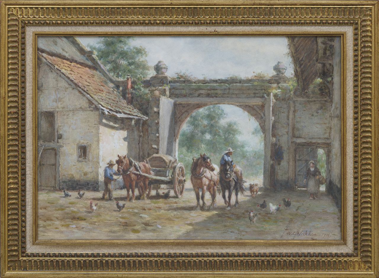 Willem Carel Nakken kunstwerk • aquarel • tekening • voorheen te koop Boerenerf met werkvolk, paarden en kippen