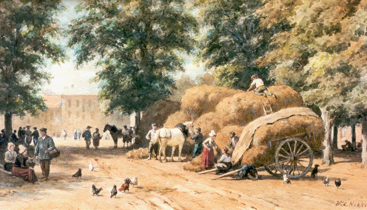 Willem Carel Nakken kunstwerk • aquarel • tekening • voorheen te koop Boerenmarkt met hooiwagens