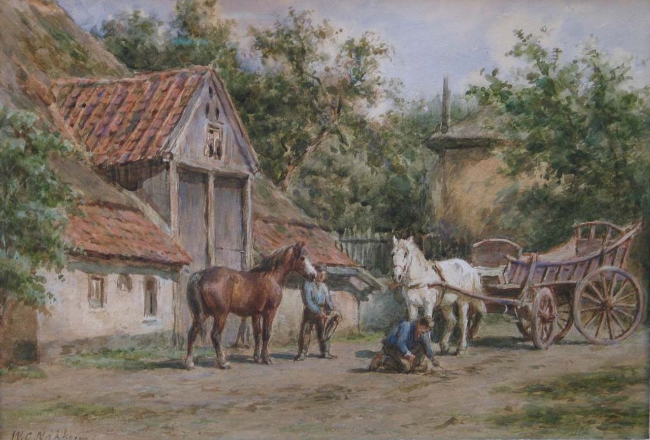 Willem Carel Nakken kunstwerk • aquarel • tekening • voorheen te koop Het aanspannen van de paarden