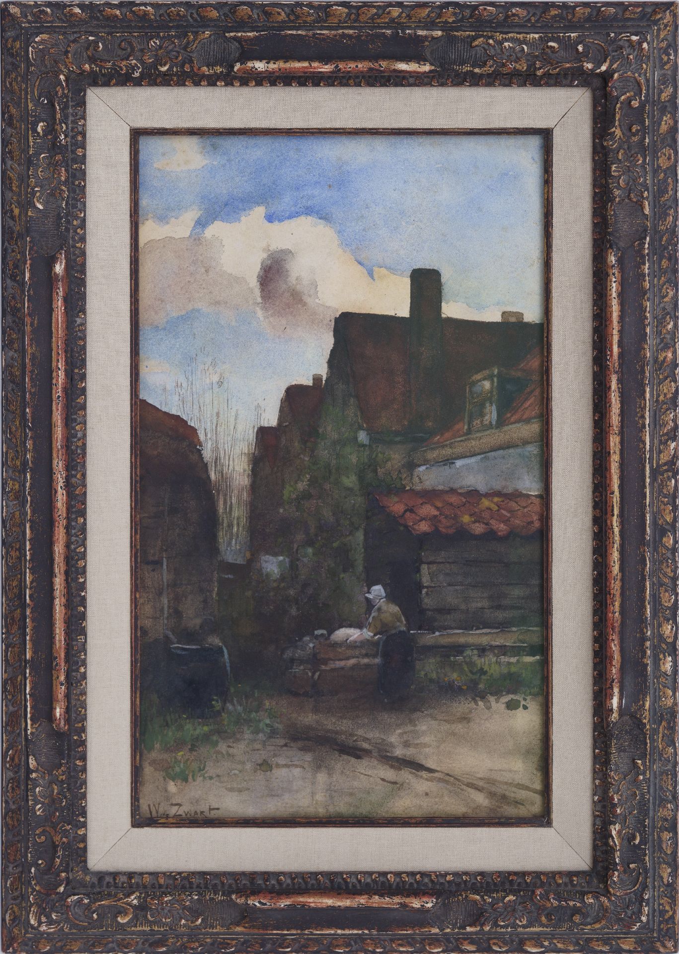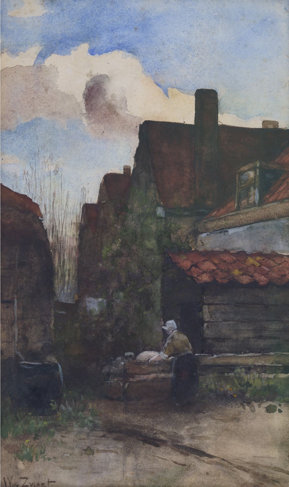 Willem de Zwart kunstwerk • aquarel • tekening • voorheen te koop Boerin voert het varken