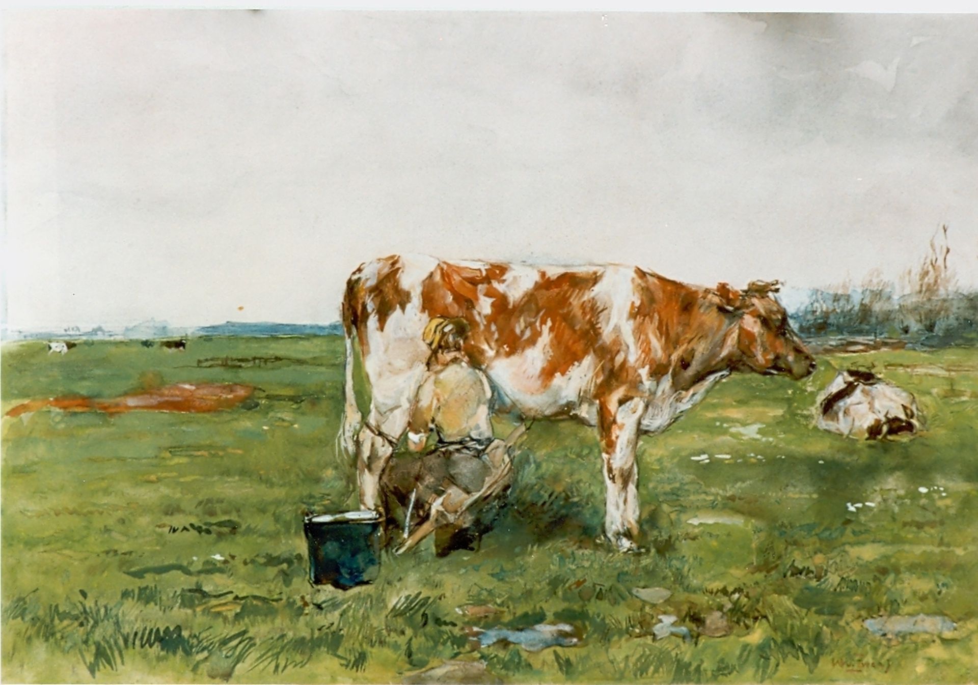 Zwart W.H.P.J. de | Wilhelmus Hendrikus Petrus Johannes 'Willem' de Zwart, Koeien melken, aquarel op papier 45,5 x 68,0 cm, gesigneerd rechtsonder