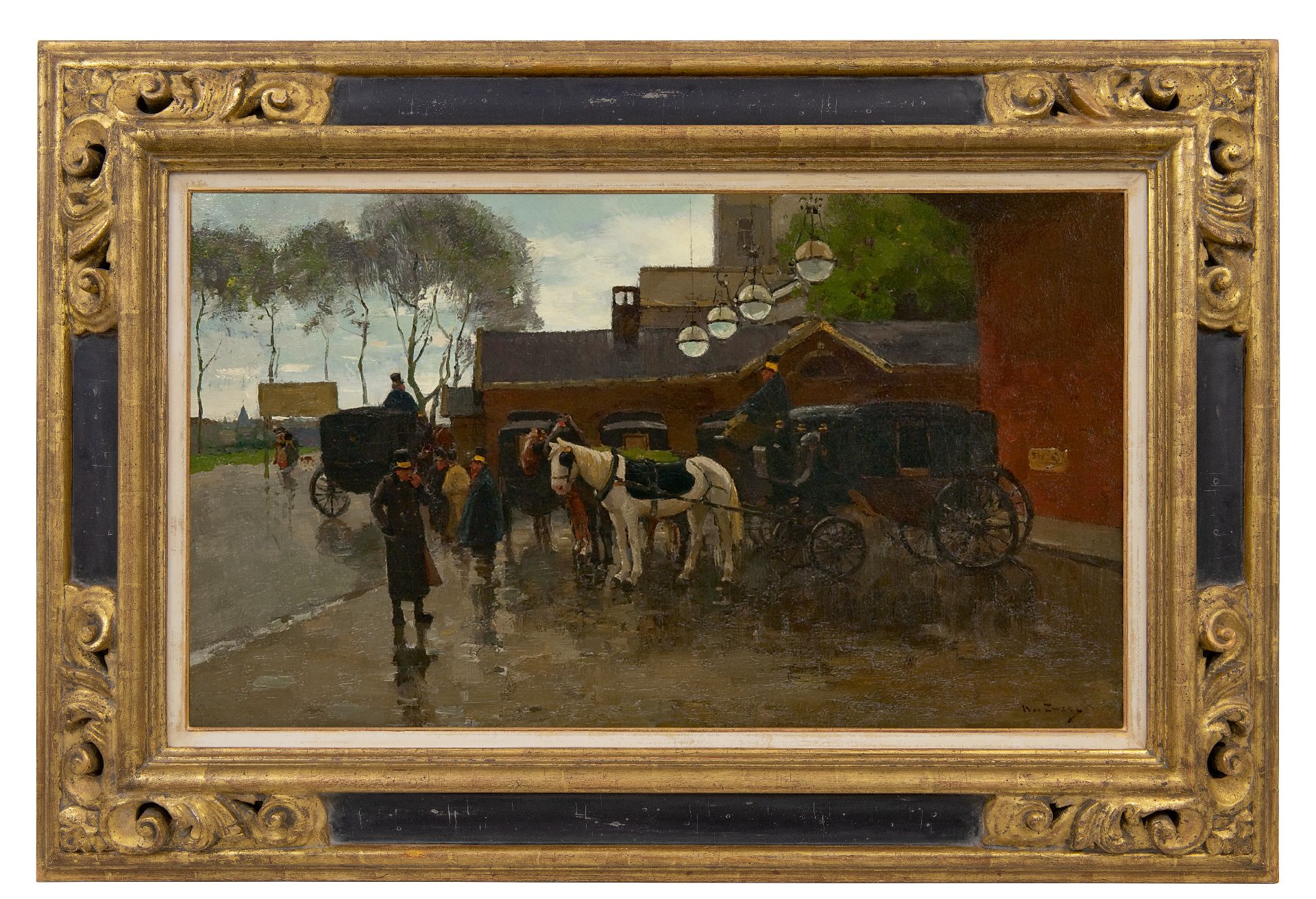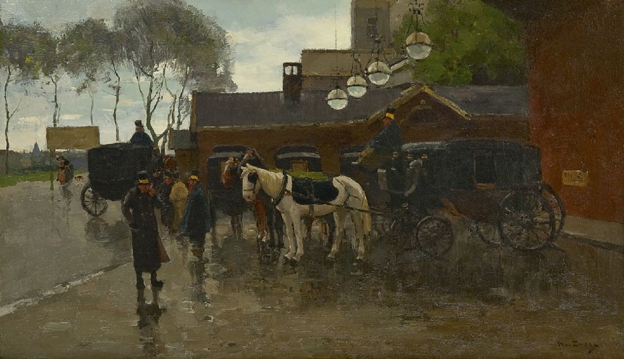 n de keuze van zijn onderwerpen behoorde Willem de Zwart tot de Haagse School, in zijn stijl en kleurgebruik tot de Amsterdamse impressionisten. Hij wordt daarom ook wel de 'Haagse Breitner' genoemd. Zijn landschappen, figuurstukken en stillevens schilderde hij met een vlotte, gedurfde penseelstreek. De verf bracht hij dik aan, soms direct uit de tube, met zo nu en dan felle kleurtoetsen in gedurfde roden, gelen en blauwen, waardoor zijn schilderijen een bijzondere levendigheid kregen. Dit gezicht op wachtende rijtuigen is een sobere, winterse voorstelling. Het is een grijze regendag, rijtuig en koetsiers worden weerspiegeld door het natte wegdek. Vanaf ongeveer 1890 tot 1894 schildert De Zwart voorstellingen van de Haagse huurrijtuigen die staan de wachten, een onderwerp dat ook terugkomt in zijn aquarellen uit deze periode.