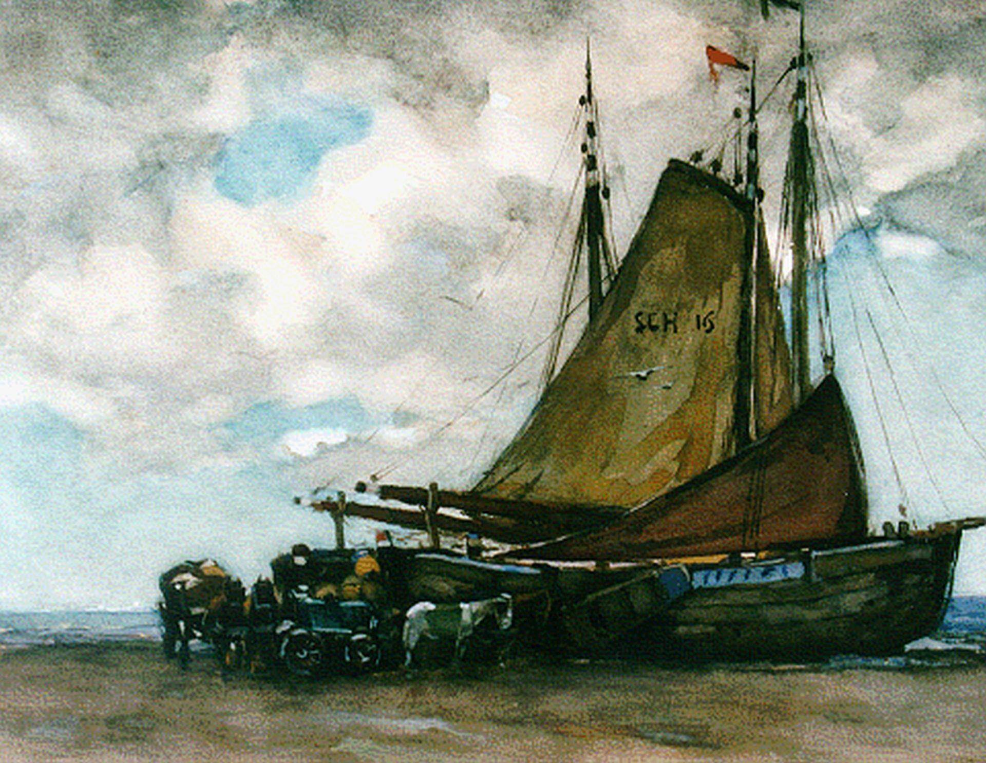 Willem de Zwart kunstwerk • aquarel • tekening • voorheen te koop Scheveningse bommen op het strand