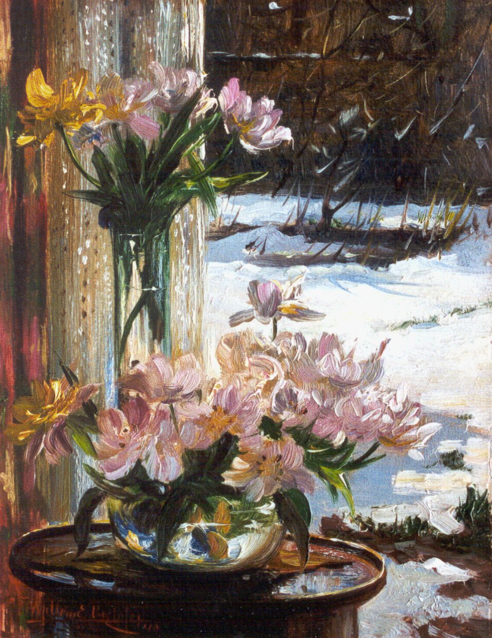 Willem Elisa Roelofs jr. kunstwerk • schilderij • voorheen te koop Bloemstilleven in de winter