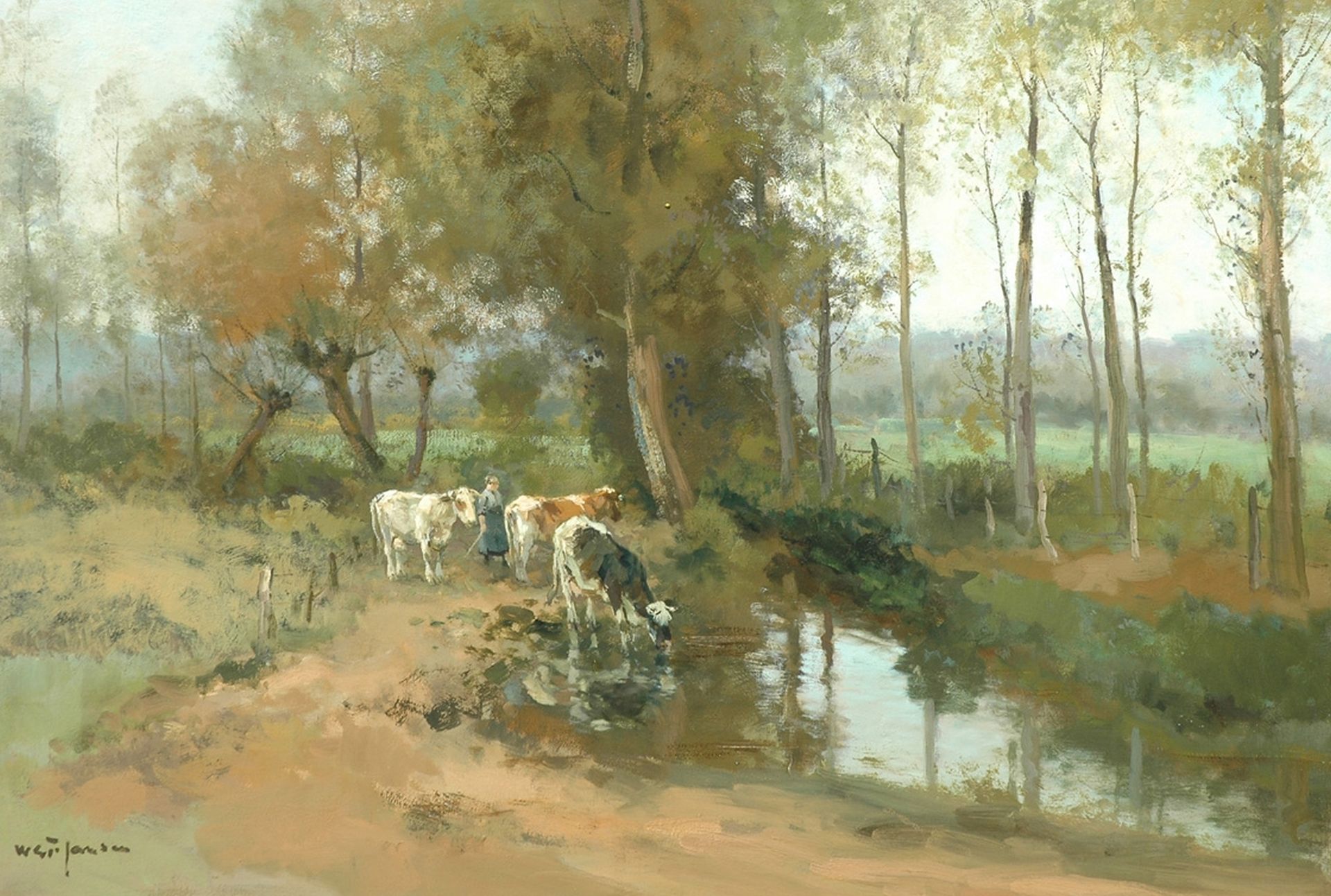 Willem George Frederik Jansen kunstwerk • schilderij • voorheen te koop Drinkende koeien bij een beek