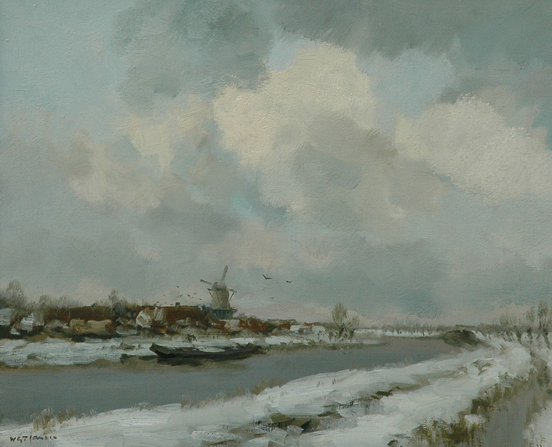 Willem George Frederik Jansen kunstwerk • schilderij • voorheen te koop Winterse poldervaart met molen