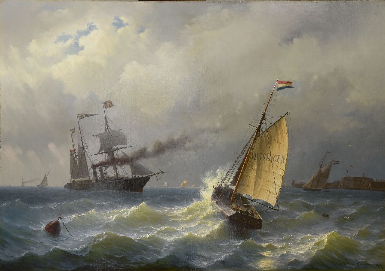 Willem Gruijter jr. kunstwerk • schilderij • voorheen te koop Loodskotter en raderstoomschip op de rede van Vlissingen