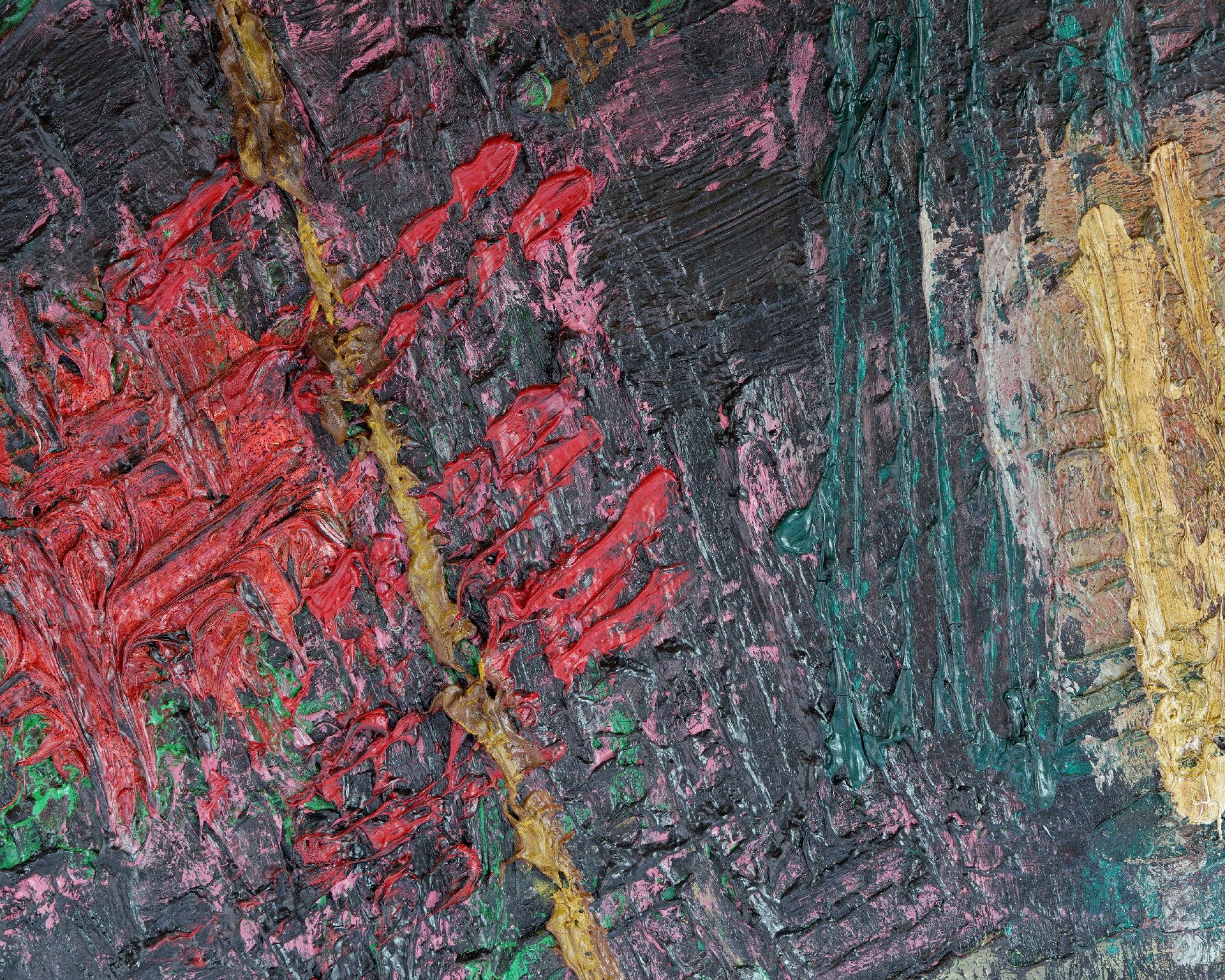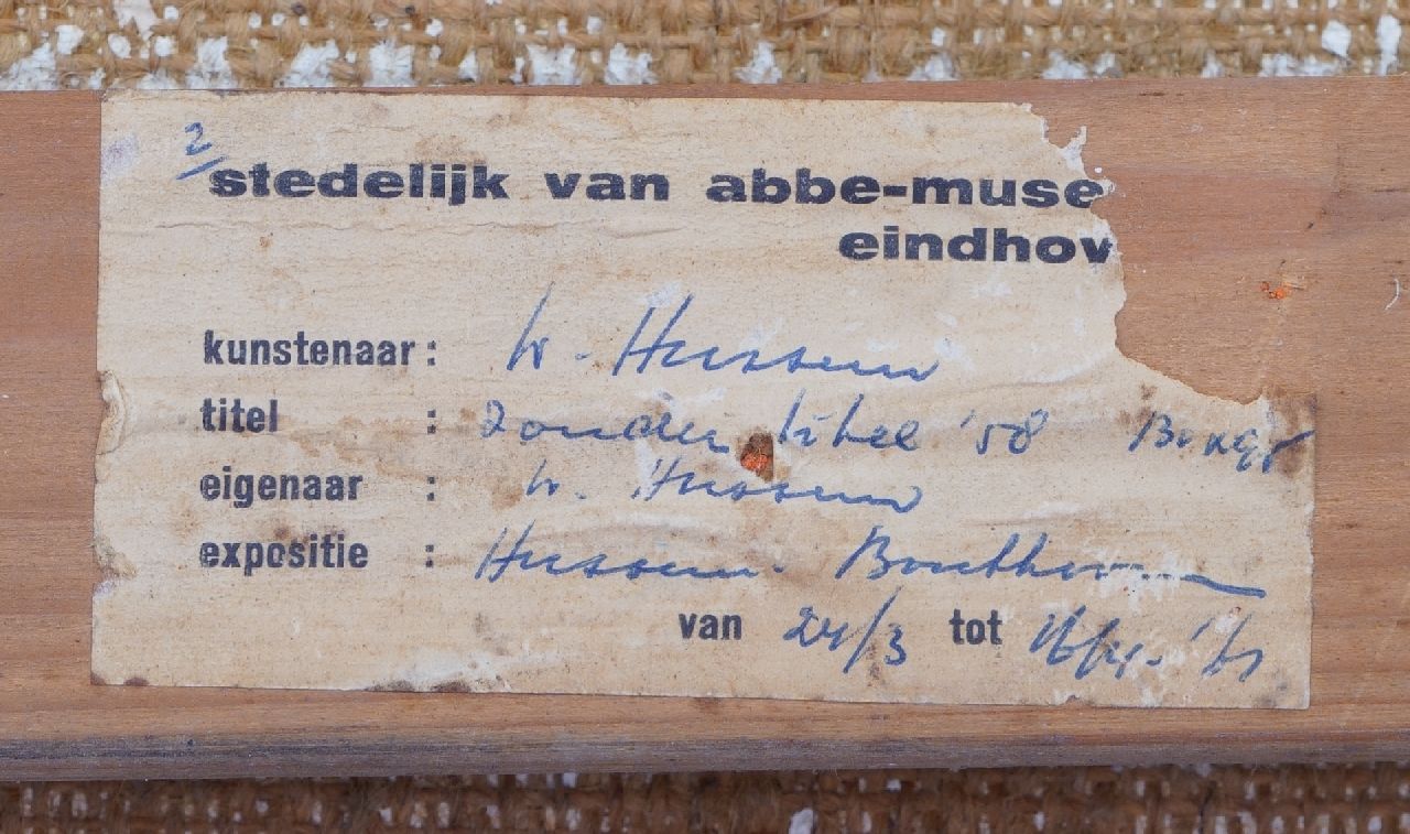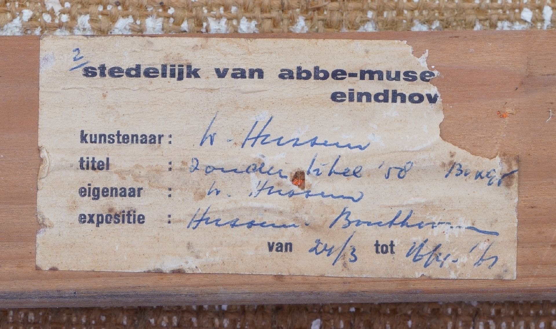 Aan het eind van de jaren 50, toen de materiekunst in opkomst was, gebruikte Hussem grover jute die de structuur van de drager benadrukte, zoals met dit werk. Voor de Biënnale van Venetië van 1960 zond hij meerdere van deze doeken in. de geur van terpentijn en doek zet aan tot avontuur de geest grijpt in de bloedvaten verwijden zich gemorste verf verbloemt de strijd het schilderij begint zijn leven. Willem Hussem