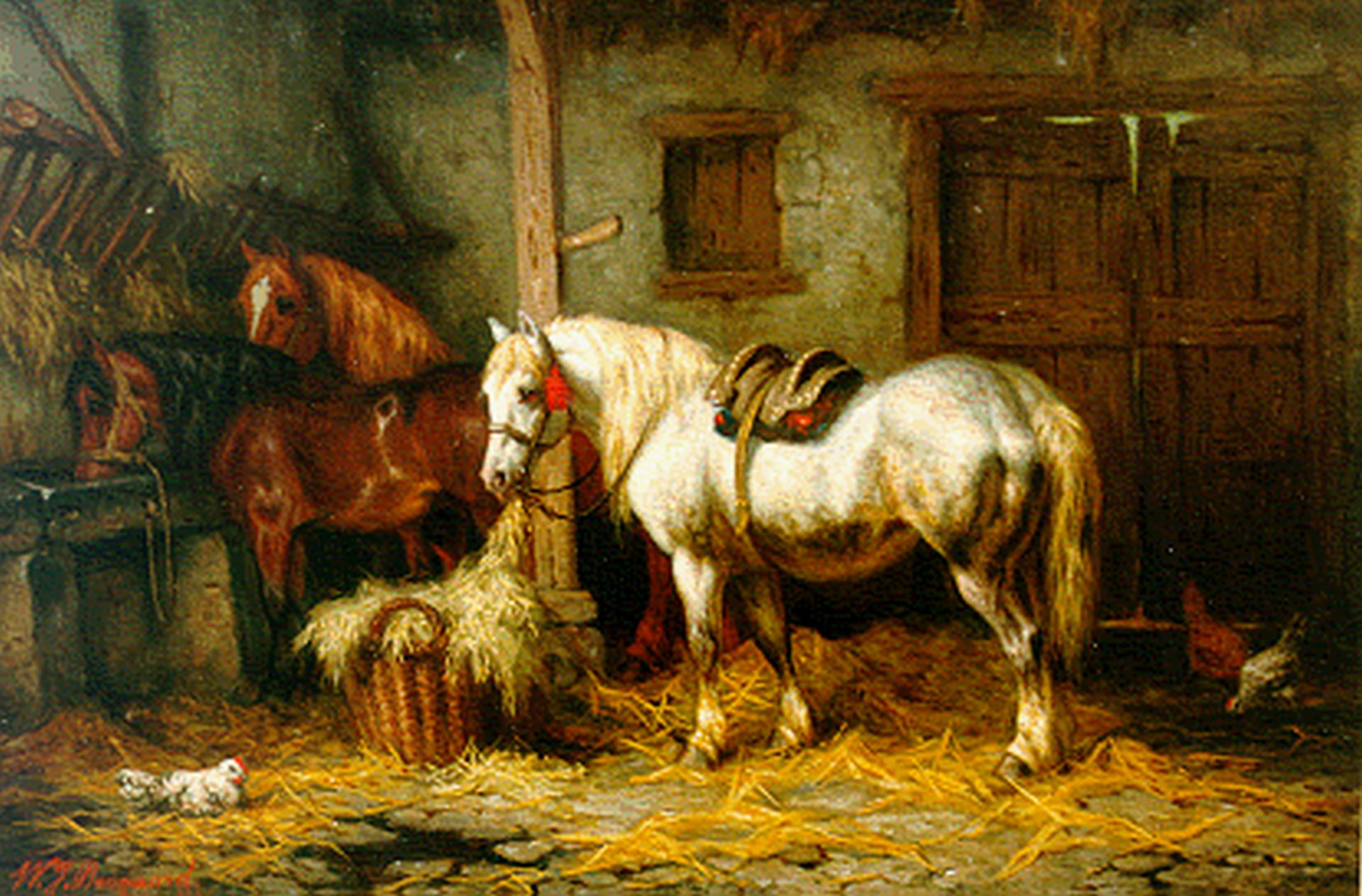 Willem Johan Boogaard kunstwerk • schilderij • voorheen te koop Drie paarden in een stal