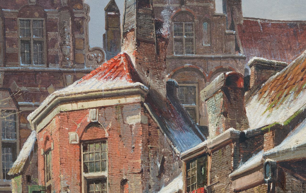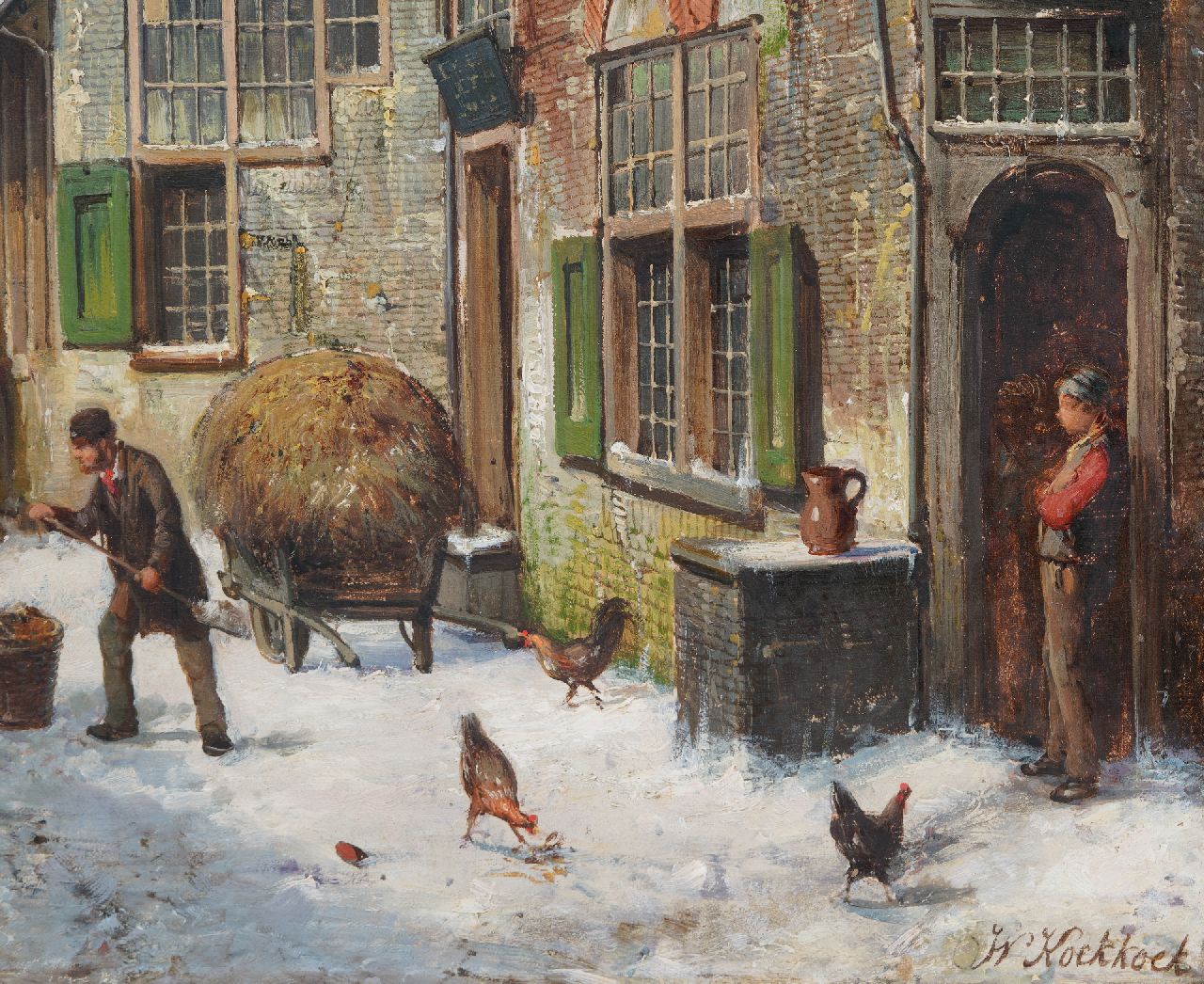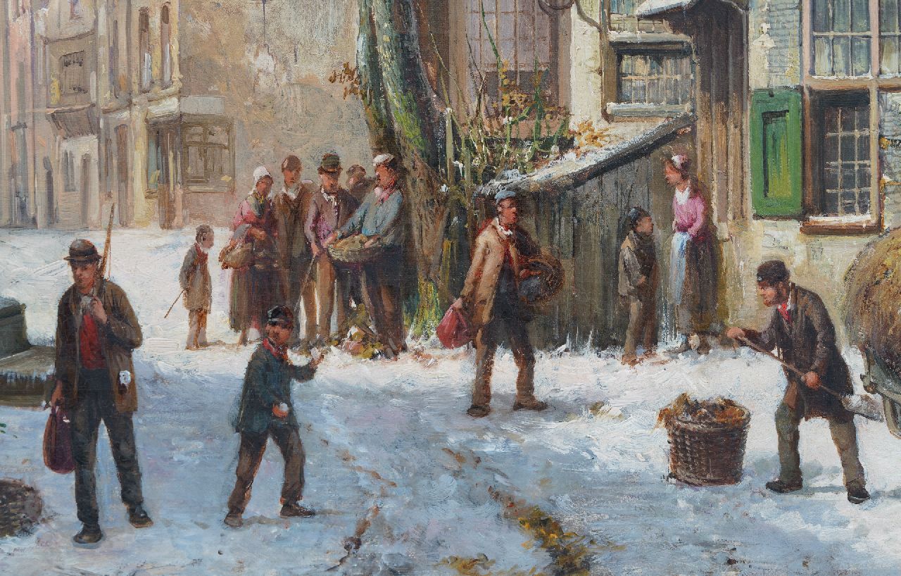 Willem Koekkoek kunstwerk • schilderij • te koop Bedrijvig straatje in de sneeuw
